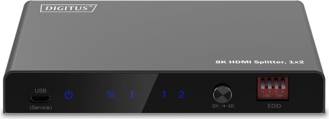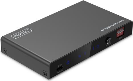 Der HDMI Splitter von DIGITUS® verteilt/spiegelt Audio- und Videosignale Ihres HDMI-Gerätes auf 2 TVs, Monitore oder Beamer in einer Auflösung von UHD 8K/60Hz. Ebenso können Audio-Signale über Toslink oder 3,5 mm Stereo Anschluss ausgekoppelt und separat wiedergegeben werden. Über den EDID-Umschalter lassen sich Einstellungen passend zu den angeschlossenen Displays vornehmen.