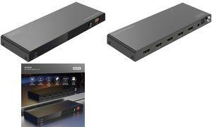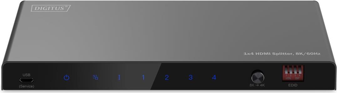 Der HDMI Splitter von DIGITUS® verteilt/spiegelt Audio- und Videosignale Ihres HDMI-Gerätes auf 4 TVs, Monitore oder Beamer in einer Auflösung von UHD 8K/60Hz. Ebenso können Audio-Signale über Toslink oder 3,5 mm Stereo Anschluss ausgekoppelt und separat wiedergegeben werden. Über den EDID-Umschalter lassen sich Einstellungen passend zu den angeschlossenen Displays vornehmen.
