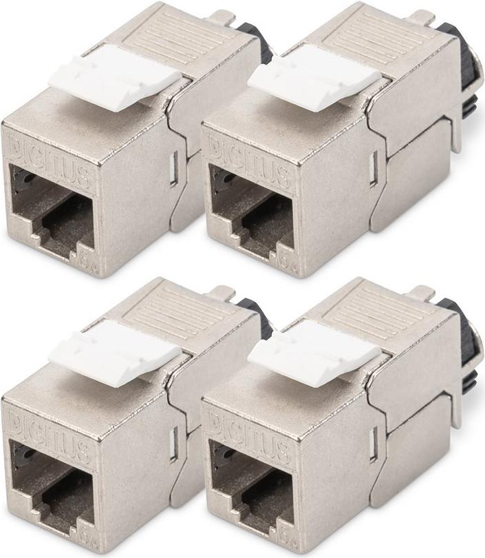 Das geschirmte CAT 6A Keystone Modul-Set DN-93617-4 von DIGITUS® überzeugt durch zukunftsorientierte Standards und High-End Qualität für Ihr Netzwerk. Die Module besitzen eine 360° Schirmkontaktierung, einen Rasthebel und einen wiederverschliessbaren, intelligenten Kabelmanager zur Zugentlastung und Kabelfixierung. Die kompakte Bauform erlaubt eine Reiheninstallation in 483 mm (19) 1HE Panel. Die werkzeugfreie Installation erfolgt über LSA-Leisten, farbcodiert nach EIA/TIA 568 A&B. Durch seine kompakte Bauform passt das Modul außerdem in designkompatible modulare Anschlussdosen.
