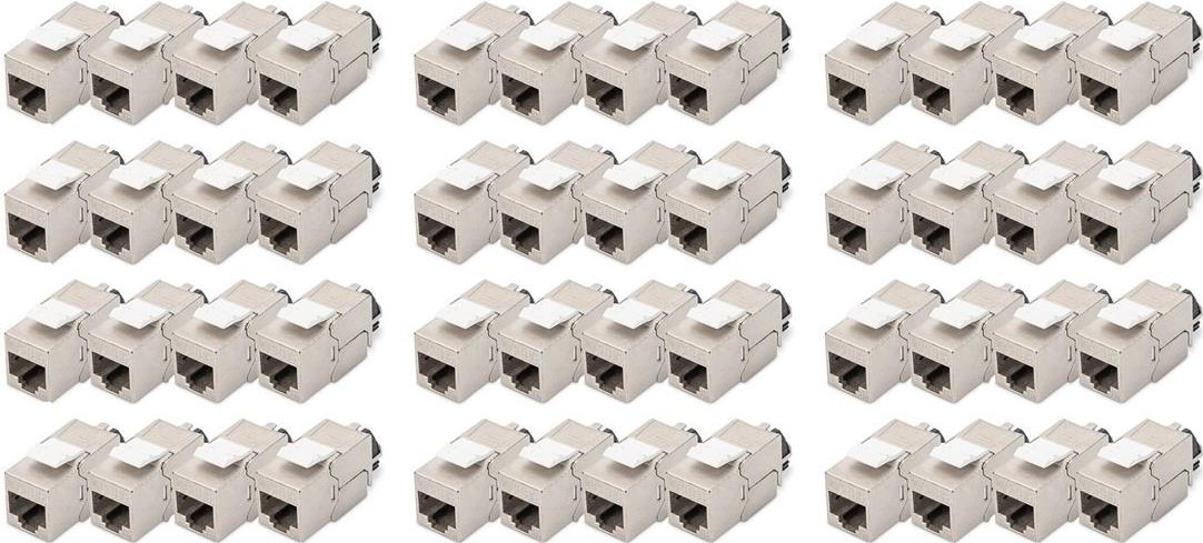 Das geschirmte CAT 6A Keystone Modul-Set DN-93617-48 von DIGITUS® überzeugt durch zukunftsorientierte Standards und High-End Qualität für Ihr Netzwerk. Die Module besitzen eine 360° Schirmkontaktierung, einen Rasthebel und einen wiederverschliessbaren, intelligenten Kabelmanager zur Zugentlastung und Kabelfixierung. Die kompakte Bauform erlaubt eine Reiheninstallation in 483 mm (19) 1HE Panel. Die werkzeugfreie Installation erfolgt über LSA-Leisten, farbcodiert nach EIA/TIA 568 A&B. Durch seine kompakte Bauform passt das Modul außerdem in designkompatible modulare Anschlussdosen.