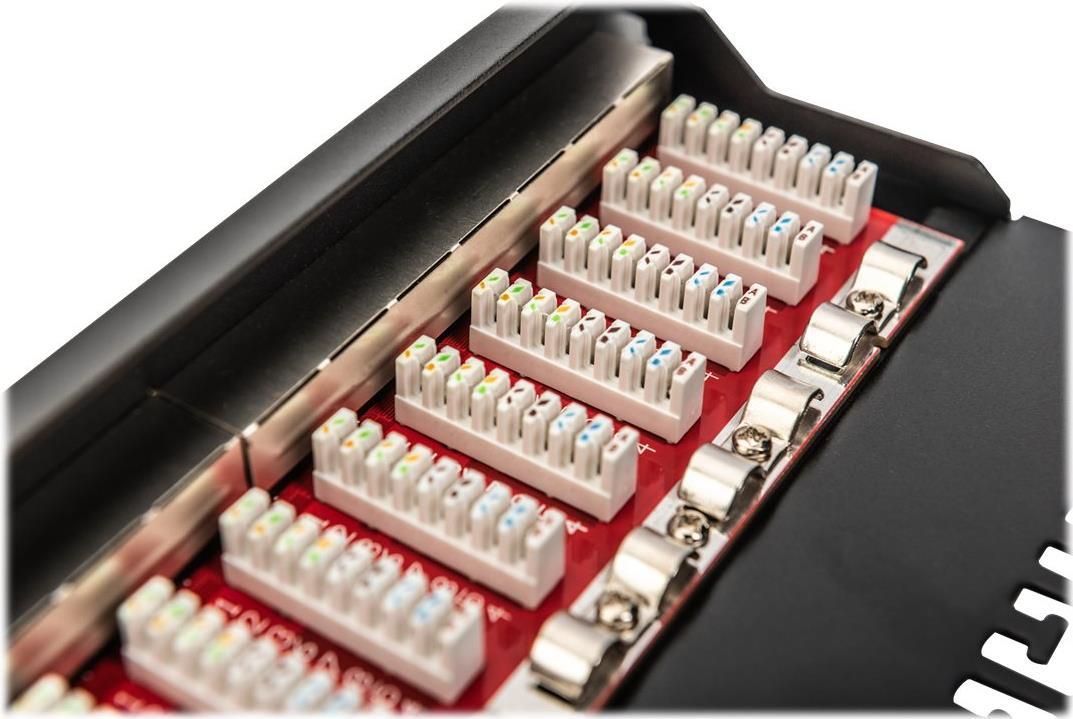 Das DIGITUS® CAT 6A Patch Panel ist erhältlich in der 12-Port Version und stellt mit dem 1,5 mm galvanisiertem kaltgewalzten Stahl ein robustes Patch Panel für die 10" Schrankmontage dar. Es entspricht dem (IEEE 802.3at/af) PoE+ Standard. Das Patch Panel ist elektromagnetisch abgeschirmt und bietet somit verlust- und störungsfreie Weiterleitung der Daten Ihrer Netzwerkinfrastruktur. Die 360° Schirmung an den Kontaktierungsstellen stellt sicher, das auch jeder einzelne Konsolidierungspunkt sauber abgeschirmt wird.