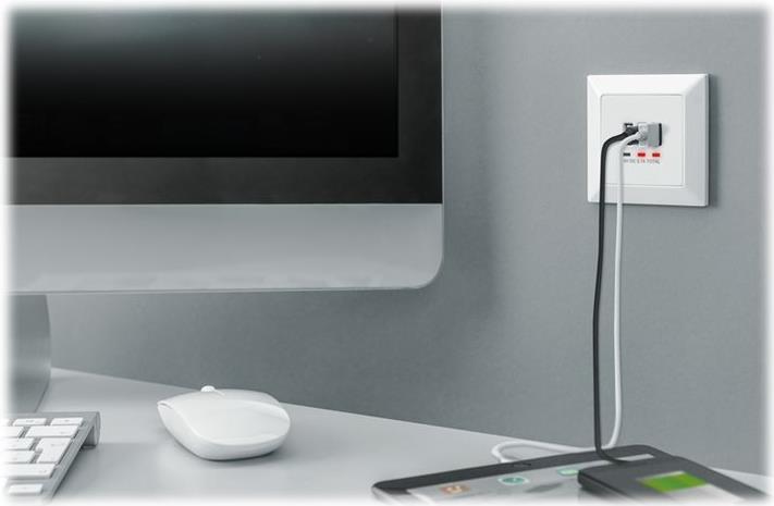 Smartphones und Tablets aufladen direkt an der Wanddose! Mit der DIGITUS® USB Lade-Dose können Sie sogar 3 Smartphones oder Tablets zeitgleich aufladen. Laden Sie ein USB-C-Gerät mit bis zu 14 W (5 V / 2,8 A) und zwei USB A-Geräte mit bis zu 14 W (5 V / 2,8 A). Laden Sie beispielsweise gleichzeitig Ihr Smartphone und Ihr Tablet mit insgesamt 15,5 W verfügbarer Ladeleistung. Schützen Sie sich und Ihre Familie durch den eingebauten elektronischen Kurzschluss- und Überlastschutz der USB-Ports. Rüsten Sie Ihre vorhandene Elektroinstallation auf und kommen Sie in den Genuß, jederzeit Ihre USB-Geräte direkt an der Wanddose aufladen zu können.