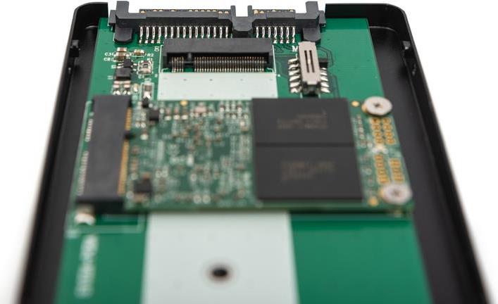 Mit dem DIGITUS 2,5\" SATA Festplattenadapter erhöhen Sie die Systemgeschwindigkeit und -leistung kostengünstig durch den Einbau einer M.2 oder mSATA SSD in Ihren PC oder Notebook. Der Festplattenadapter wird wie eine Standard 2,5\" Festplatte mit SATA III Anschluss verwendet, durch die geringe Einbauhöhe von nur 7 mm kann ein Einbau in alle gängigen Notebooks erfolgen. Es werden M.2 (NGFF) SSDs von folgendem Typ unterstützt: M.2 Typ 2230, 2242, 2260, 2280 mit B-Key und B+M-Key. Eine Unterstützung von M.2 PCIe NVMe-SSDs mit M-Key ist nicht gegeben. Weiterhin werden mSATA SSDs mit Mini PCIe 52 PIN Anschluss als full size Variante unterstützt. Per DIP Switch auf der Platine wird die jeweilig eingebaute SSD ausgewählt. Bootvorgänge werden vom Adapter für alle Standard Betriebssysteme wie Windows, Mac OS oder Linux unterstützt. Der innenliegende SSD Speicher wird durch das vollständig geschlossene Aluminiumgehäuse vor Staub und Beschädigung geschützt. Durch die SATA III Schnittstelle bietet sich eine Datenübertragungsgeschwindigkeit von 6 Gbit/s, die Lesegeschwindigkeit kann, abhängig von der eingesetzten SSD bis zu 520 MB/s betragen. Der Adapter unterstützt SATA Rev.3.2 mit DEVSLP Energiesparmodus.