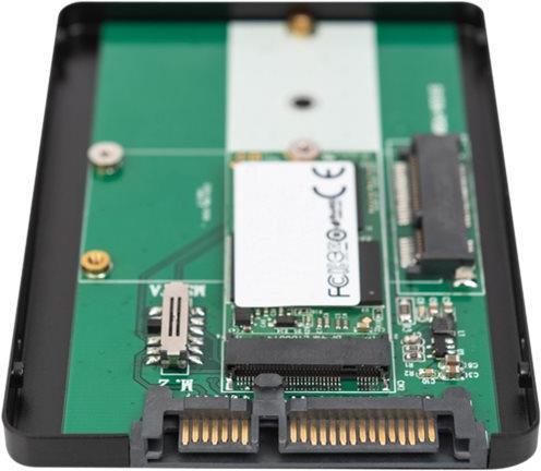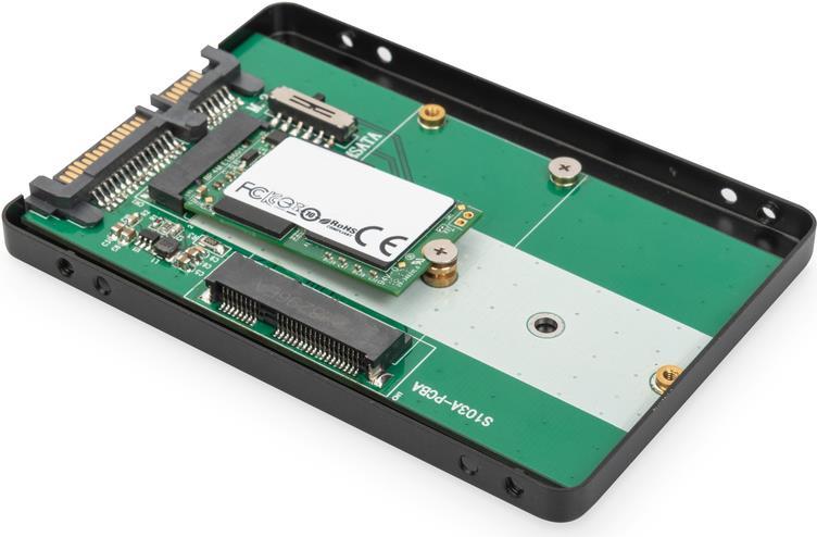 Produkttext[/head]Nutzen Sie eine M.2 oder mSATA SSD als 2,5\" Festplatte für Ihren PC oder NotebookGeeignet für M.2 SSD (2230, 2242, 2260, 2280) mit B-Key oder B+M-KeyGeeignet für mSATA SSD (full size)Ermöglicht Bootvorgänge von der eingebauten SSDMit dem DIGITUS® 2,5\" SATA Festplattenadapter erhöhen Sie die Systemgeschwindigkeit und -leistung kostengünstig durch den Einbau einer M.2 oder mSATA SSD in Ihren PC oder Notebook. Der Festplattenadapter wird wie eine Standard 2,5\" Festplatte mit SATA III Anschluss verwendet, durch die geringe Einbauhöhe von nur 7 mm kann ein Einbau in alle gängigen Notebooks erfolgen. Es werden M.2 (NGFF) SSDs von folgendem Typ unterstützt: M.2 Typ 2230, 2242, 2260, 2280 mit B-Key und B+M-Key. Eine Unterstützung von M.2 PCIe NVMe-SSDs mit M-Key ist nicht gegeben. Weiterhin werden mSATA SSDs mit Mini PCIe 52 PIN Anschluss als full size Variante unterstützt. Per DIP Switch auf der Platine wird die jeweilig eingebaute SSD ausgewählt. Bootvorgänge werden vom Adapter für alle Standard Betriebssysteme wie Windows, Mac OS oder Linux unterstützt. Der innenliegende SSD Speicher wird durch das vollständig geschlossene Aluminiumgehäuse vor Staub und Beschädigung geschützt. Durch die SATA III Schnittstelle bietet sich eine Datenübertragungsgeschwindigkeit von 6 Gbit/s, die Lesegeschwindigkeit kann, abhängig von der eingesetzten SSD bis zu 520 MB/s betragen. Der Adapter unterstützt SATA Rev.3.2 mit DEVSLP Energiesparmodus.2,5\" Festplattenadapter mit 7 mm BauhöheGeeignet für M.2 SSD (2230, 2242, 2260, 2280) mit B-Key oder B+M-KeyGeeignet für mSATA SSD (full size)Ermöglicht Bootvorgänge von der eingebauten SSDSATA III Schnittstelle mit 6 Gbit/sLesegeschwindigkeit bis 520 MB/sSATA Rev.3.2 mit DEVSLP EnergiesparmodusModus Einstellung über DIP SwitchGeschlossenes Aluminiumgehäuse[head]Hauptmerkmale