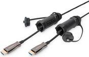 Dieses aktive HDMI® AOC Hybrid-Glasfaserkabel eignet sich ideal, um unkomprimierte Video- und Audiodaten mit hoher Bandbreite über längere Distanzen zu übertragen. Durch die Hybrid-Konstruktion von Kupfer- und Glasfaserleitern sind elektromagnetische Einflüsse ausgeschlossen, dies gewährleistet eine verlustfreie Übertragung über die gesamte Kabellänge mit UHD-Auflösungen von bis zu 4K/60Hz und Bandbreiten von bis zu 14,4 Gbps. Durch den Einsatz von optischen Leitern (Glasfaser) ist der Durchmesser dieses aktiven Kabels sehr gering (OD: 5,2mm). Die Stahl- und Aramidfaserkonstruktion des Kabels sorgt für den optimalen Schutz gegen Äußerekräfte, so ist das Kabel Trittfest und Stichfest. Bei einem nicht Gebrauch des Kabels schützen die Schutzhülsen die Anschlüsse (IP68). Der Ideale Begleiter für den Einsatz auf Messen, Konzerten und andere Events. Die benutzerfreundliche Installation erfolgt hierbei durch einfaches Plug and Play, einstecken und sofort höchste Bildqualität geniessen. Unterstützt werden zahlreiche Standards, wie z.B. HDMI 2.0, HDCP 2.2 oder HDR. Im Audiobereich werden unter anderem ARC, DTS-HD Master Audio oder Dolby TrueHD sowie viele weitere Features unterstützt. Der Einsatz neuester Chiptechnologie ermöglicht die Übertragung des vollen HDMI®-Signalspektrums und unterstützt dabei CED, EDID mit sehr geringer Latenz und unkomprimiert.