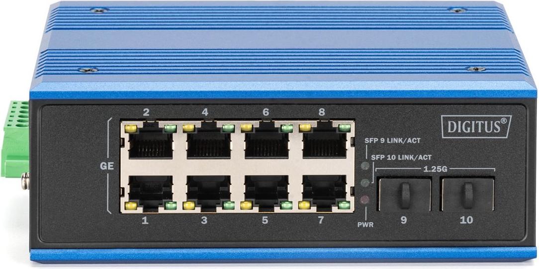 Digitus Industrial 8 +2-Port Gigabit Ethernet Switch. Switch-Typ: Unmanaged. Basic Switching RJ-45 Ethernet Ports-Typ: Gigabit Ethernet (10/100/1000), Anzahl der basisschaltenden RJ-45 Ethernet Ports: 8, Anzahl installierten SFP Module: 2. Vollduplex. MAC-Adressentabelle: 4000 Eintragungen, Routing-/Switching-Kapazität: 1 Gbit/s. Netzstandard: IEEE 802.3x. DC input Spannung: 12 - 48 V (DN-651150)
