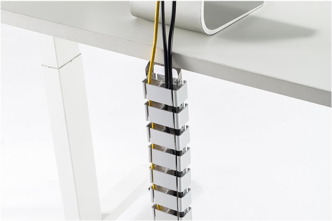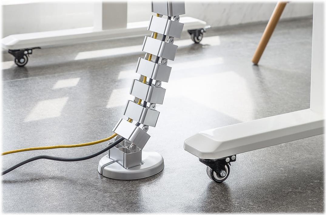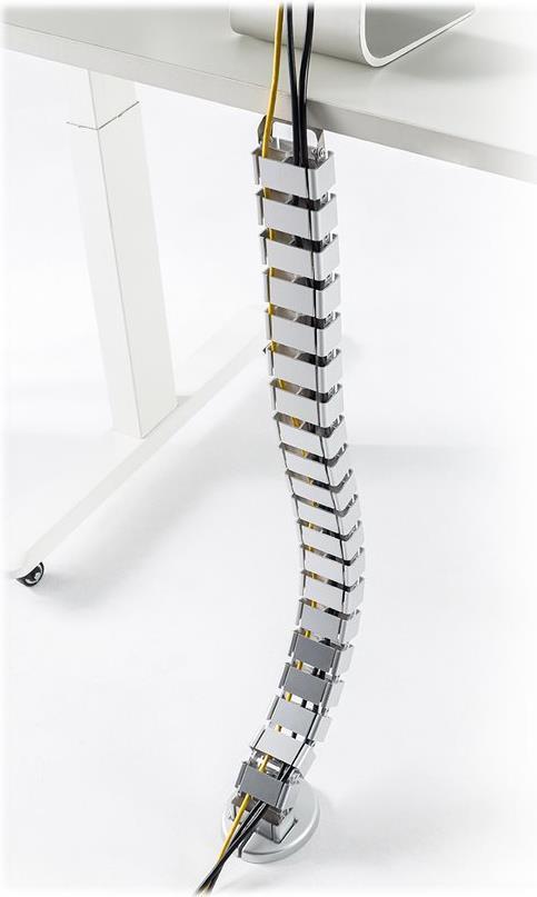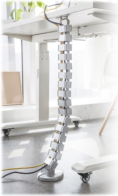 Die flexible Kabelführung von DIGITUS® stellt die ideale Lösung nicht nur für höhenverstellbare Tische dar. Die einzelnen Glieder lassen sich nach Belieben entfernen oder hinzufügen, somit können Sie die Länge individuell der maximalen Tischhöhe anpassen. Beim Absenken eines höhenverstellbaren Tisches legt sich die Kabelführung ordentlich zusammen ohne zu verheddern oder Kabelsalat zu verursachen, dabei hält der beschwerte Metallfuß die Kabelführung stabil am Boden. Die Befestigung am Tisch erfolgt über den Winkel, der sich am oberen Ende der Kabelschlange befindet. Sie können insgesamt eine maximale Tischhöhe von bis zu 130 cm realisieren. Innerhalb der Kabelführung stehen 4 separate Kanäle zur Verfügung, um Kabel aller Art ordentlich und sauber zu verlegen. Jedes Modul verfügt über eine flexible Öffnung zum leichten Ein- und Ausführen der Kabel. Schaffen Sie Ordnung unter Ihrem Schreibtisch!
