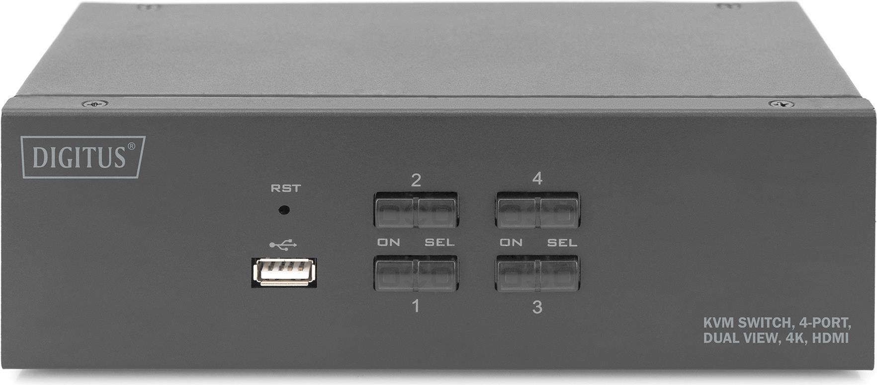 Mit dem DIGITUS® 4-Port KVM-Switch für Dual-Displays haben Sie die Möglichkeit, vier 4K-fähige PCs über eine einzige USB-Tastatur- und Mauskombination zu bedienen. Per Knopfdruck oder Hotkey schalten Sie bequem zwischen den vier PCs um und sparen sich aufwendiges Umstecken sämtlicher Kabel. Die Ausgabe an bis zu zwei Monitore erfolgt über die zwei HDMI® Ausgänge an der Rückseite. Audiosignale von Mikrofon und Lautsprecher werden ebenfalls umgeschaltet. Zusätzlich ist ein USB-Anschluss an der Frontseite vorhanden, der für weitere Peripheriegeräte wie z. B. USB-Sticks oder externe Festplatten an beiden PCs genutzt werden kann. Die angeschlossenen Peripherie-Geräte werden jeweils dem aktiven PC zugeordnet. Status-LED an der Frontseite des Switches zeigen Ihnen jederzeit die aktuelle Konfiguration an. Abgerundet wird der Switch durch das robuste Metallgehäuse.