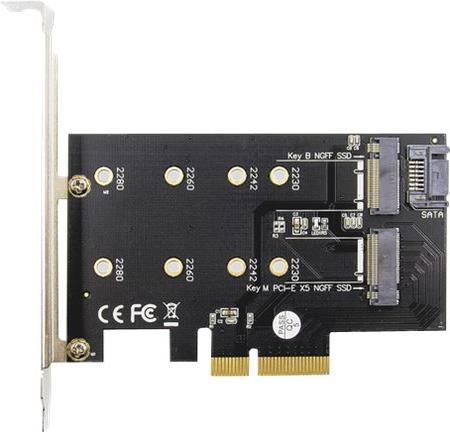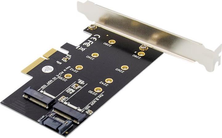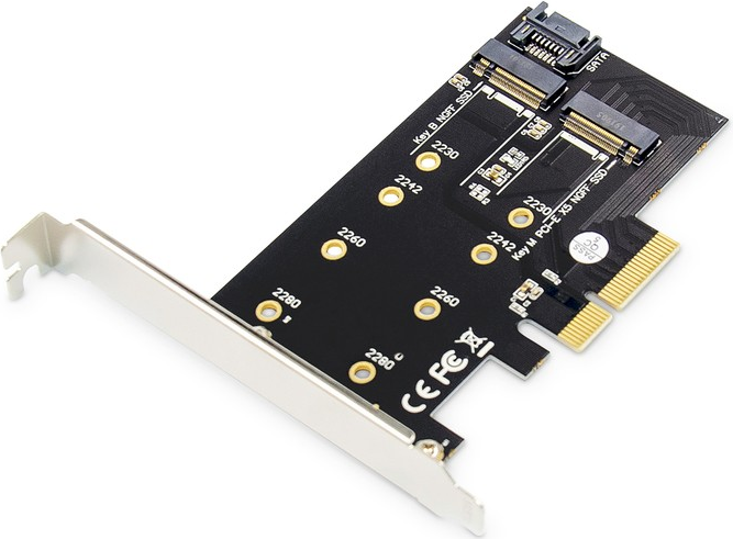 Diese PCIe x4-Adapterkarte ist geeignet für M.2 / NGFF Speichermedien (NVMe) mit B, M, B+M Key und den Abmessungen 2230, 2242, 2260 & 2280. Zusammen mit der x4-Schnittstelle und dem PCIe 3.0 Standard sind Datenübertragungen von bis zu 6 Gbps (32GT/s) möglich. Die Speichermedien können wahlweise über die integrierte SATA-Schnittstelle bei M.2 SATA SSDs oder über die PCIe-Schnittstelle bei NVMe PCIe SSDs angebunden werden. Setzen Sie den Turbo ein - mit der multifunktionalen M.2 PCIe 3.0 Add-On Karte von DIGITUS®.