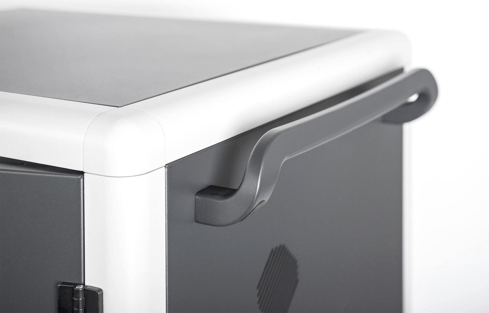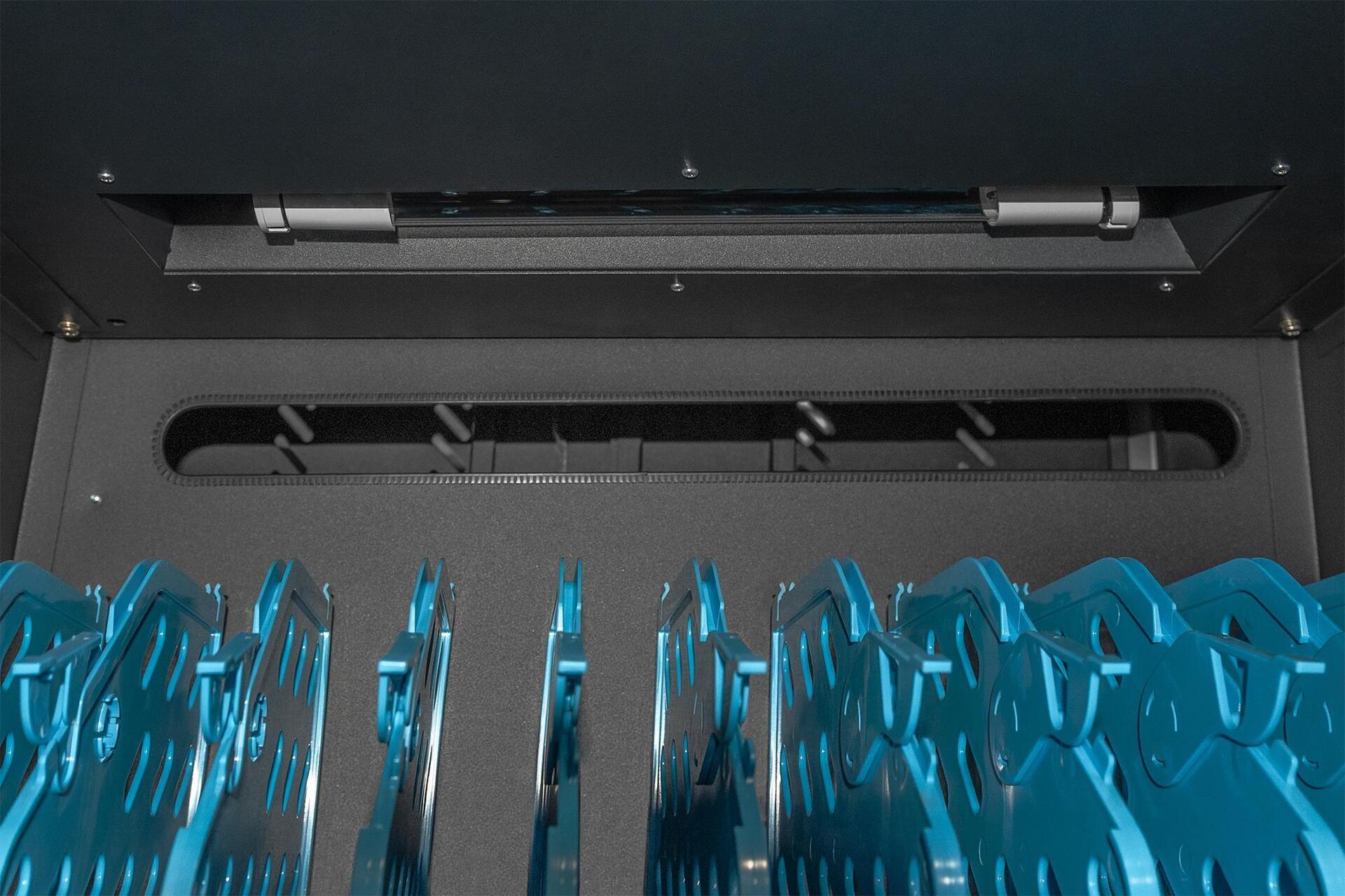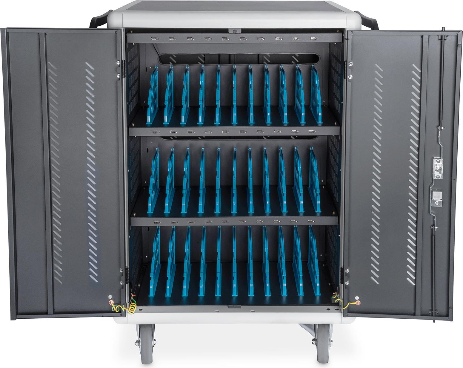Der mobile Ladeschrank von DIGITUS® ist die ideale und kompakte Lösung zur Aufbewahrung und zum Aufladen Ihrer portablen Geräte, wie z. B. Notebooks und Tablets. Häufig werden mobile Ladeschränke in öffentlichen Einrichtungen wie z. B. Schulen genutzt, um die Geräte an einem zentralen Ort gesichert aufzubewahren und gleichzeitig laden zu können. Der Schrank beinhaltet 3 Reihen mit jeweils 10 Ladeplätzen, von dem jeder über einen eigenen USB-Anschluss an der Vorderseite verfügt. Zusätzlich können die Geräte rückseitig mit verbauten Steckdosenleisten (3 x 10-fach Schutzkontakt) verbunden werden. Dank der großzügigen Kabeldurchführungen und Überlängenablagen ist ein optimales Kabelmanagement garantiert. Verbaute Lüfter (3 x 24 V) in Verbindung mit Lüftungsschlitzen sorgen für eine aktive Entwärmung des Schrankes. Verbaute UV-C Lampen sorgen für sterilere Verhältnisse und somit für eine umweltfreundliche, verbesserte Hygiene. Zur zentralisierten Synchronisation von Daten kann ein Gerät an dem außenliegenden USB-Port angeschlossen werden.