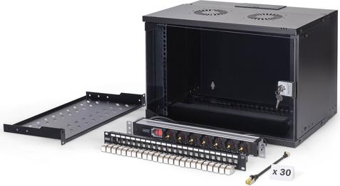 Ob Privatbereich, Büro oder bei Unterverteilungen mit geringen Platzverhältnissen: Mit den kompakten 483 mm (19)-Lösungen der SOHO Pro Serie installieren Sie ihr Netzwerk, wo sie es möchten. Die Montage erfolgt in wenigen Schritten und ist dank beiliegender Schritt-für-Schritt Anleitung kinderleicht. Erhältlich in vier Ausführungen von Höheneinheiten (4HE, 7HE, 9HE, 12HE) werden in diesen Netzwerk-Sets perfekt aufeinander abgestimmte DIGITUS Komponenten ergänzt, um schnell und einfach eine einsatztaugliche IT-Verkabelung zu gewährleisten. Der Netzwerkschrank sowie das jeweilige Zubehör (bspw. Switch, Patch Panel, Steckdosenleiste, Fachboden, Kabelführungspanel, Patchkabel, etc.) werden in einem kompakten Karton geliefert.