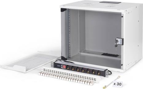 Ob Privatbereich, Büro oder bei Unterverteilungen mit geringen Platzverhältnissen: Mit den kompakten 483 mm (19)-Lösungen der SOHO Pro Serie installieren Sie ihr Netzwerk, wo sie es möchten. Die Montage erfolgt in wenigen Schritten und ist dank beiliegender Schritt-für-Schritt Anleitung kinderleicht. Erhältlich in vier Ausführungen von Höheneinheiten (4HE, 7HE, 9HE, 12HE) werden in diesen Netzwerk-Sets perfekt aufeinander abgestimmte DIGITUS Komponenten ergänzt, um schnell und einfach eine einsatztaugliche IT-Verkabelung zu gewährleisten. Der Netzwerkschrank sowie das jeweilige Zubehör (bspw. Switch, Patch Panel, Steckdosenleiste, Fachboden, Kabelführungspanel, Patchkabel, etc.) werden in einem kompakten Karton geliefert.