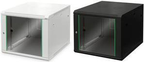 Die Netzwerkschränke zur Wandmontage der Dynamic Serie wurden für einen einfachen und besonders kostenoptimierten Netzwerkausbau entwickelt. Dach, Boden und Rückwand eines jeden Schrankes sind mit einem vorgestanzten Kabeleinlass ausgestattet. Für die Aufnahme eines Lüftermoduls wird das Dachchassis ebenfalls mit einem ausgestanzten Bereich versehen. Zwei Paar galvanisierte, mit in beide Richtungen ablesbare Höheneinheiten beschriftete 483 mm (19")-Profilschienen sind im Inneren verbaut. Diese lassen sich in der Tiefe verstellen. Jeder Schrank ist eine robuste Stahlkonstruktion aus bis zu 1,5 mm starkem Stahlblech. Die Farbgebung erfolgt in Form von elektrostatischer Pulverbeschichtung in den Standardfarben Grau (RAL 7035) und Schwarz (RAL 9005). Abnehmbare Seitenwände sowie die abschließ- und abnehmbare Fronttür, verbessern die Zugänglichkeit. Ein Türanschlagswechsel kann vorgenommen werden. Die Wandmontage erfolgt in zwei einfachen Arbeitsschritten: Das mitgelieferte Montageblech wird an die Wand geschraubt und im Anschluss mit dem Gehäuse verbunden.