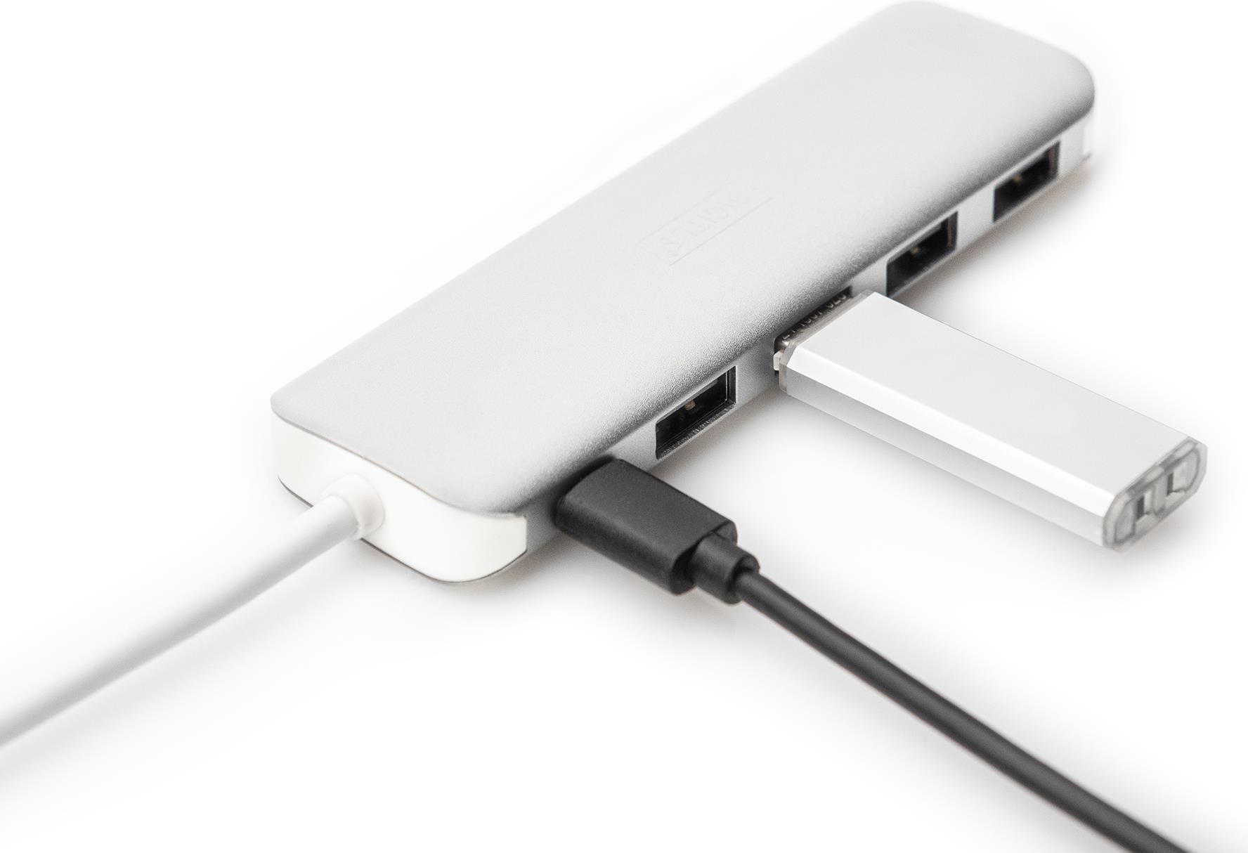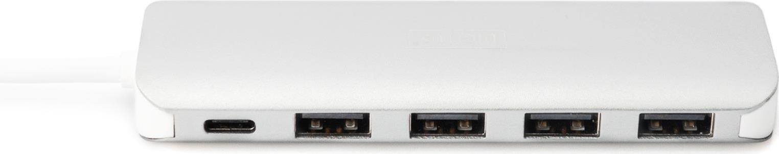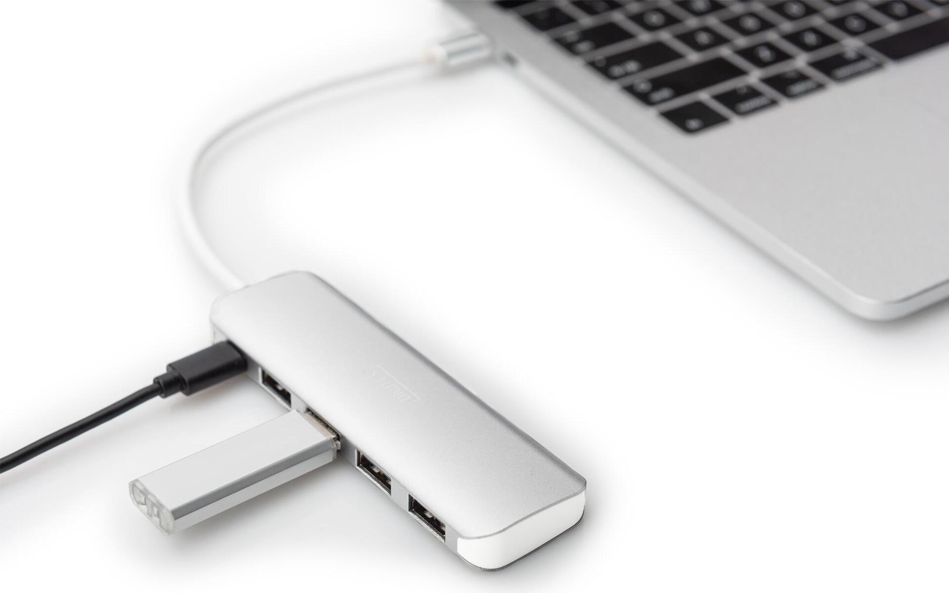 Mit diesem USB Type-C 4-Port Hub erweitern Sie Ihren vorhandenen Laptop mit USB-C Port um vier USB 3.0 Ports. Nutzen Sie bis zu vier weitere USB Geräte, wie Maus, Keyboard oder USB-Sticks an Ihrem Laptop. Zusätzlich befindet sich ein USB-C (PD) Anschluss an dem Hub, über welchen Sie Ihren Laptop laden können. Der Digitus USB-C 4-Port Hub ist dank seines schlanken Designs der ideale Begleiter auf Reisen, aber auch in Home & Office unentbehrlich.
