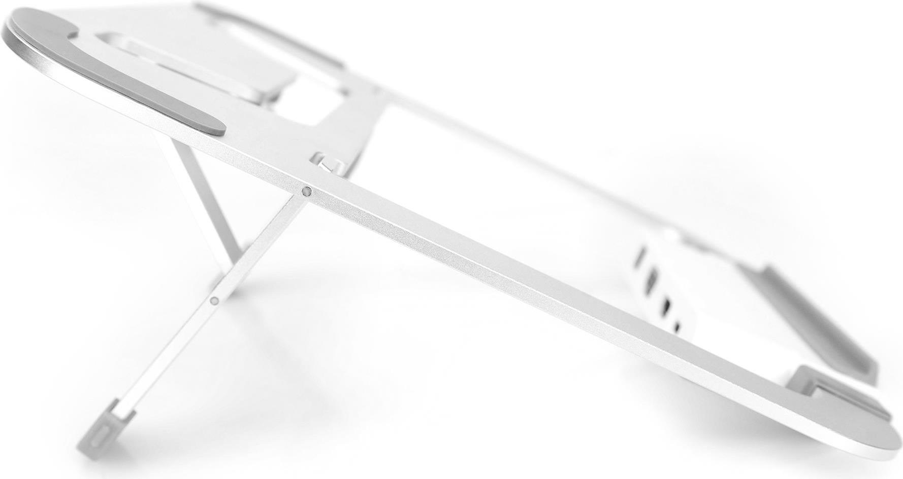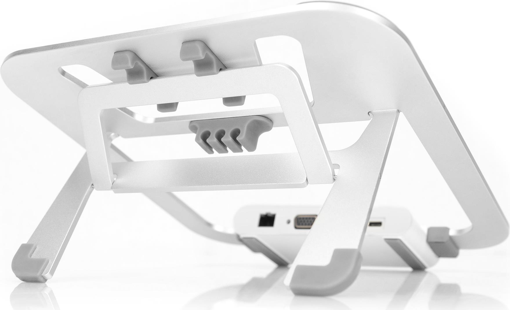 Notebook-Ständer mit integrierter Docking Station - vereint Ergonomie und Konnektivität zu einer portablen Lösung- Erweitert Ihr Notebook um 8 weitere Schnittstellen für Video, Daten, Power & Ethernet- Individuell an die Körpergröße anpassbar, 4 verschiedene Neigungswinkel einstellbar (15°-30°)- Platzsparendes und faltbares Design - ideal für Unterwegs, Home & Office- Geeignet für 10\"-15\" Notebooks- 2 x Videoanschlüsse: 1 x UHD 4K HDMI® Anschluss / 1 x Full HD VGA-Anschluss- 2 x USB-C™ Anschluss: 1 x Host für die Verbindung zum Notebook / 1 x PD 3.0 (Power Delivery) USB-C™ Anschluss für schnelles Laden Ihres Notebooks- 1 x RJ45 Gigabit Ethernet Schnittstelle - Verbindung des Notebooks mit dem Internet / LAN- 2 x USB 3.0 Anschlüsse (SuperSpeed, 5 Gbps) - Datenübertragung / Laden von Mobilgeräten (5 V / 0,9 A)- Schlankes Rahmendesign für optimale Kühlung des NotebooksDer verstellbare Notebooksständer von DIGITUS® kombiniert Ergonomie und Konnektivität zu einer praktischen Einheit. Spielend leicht können Sie den Neigungswinkel Ihrer Körpergröße in 4 Stufen anpassen. Über den USB-C™ Port lässt sich Ihr Notebook anschliessen, so haben Zugriff auf sämtliche Schnittstellen der integrierten Docking Station. An der Frontseite befinden sich ein vollfunktionsfähiger USB-C™ Port, zwei USB A Ports (USB 3.0) und ein Kartenleser für SD- und microSD-Karten. An der Rückseite lassen sich zwei Monitore anschliessen (HDMI + VGA), ein RJ45-Netzwerkkabel (LAN), sowie ein USB-C™ Netzteil, welches beispielsweise den Ladestrom (Power Delivery) für ein angeschlossenes Notebook liefern kann. Nutzen Sie die Vorteile von Ergonomie und Konnektivität in einer Einheit mit dem DIGITUS® Notebook-Ständer mit integrierter Docking Station.