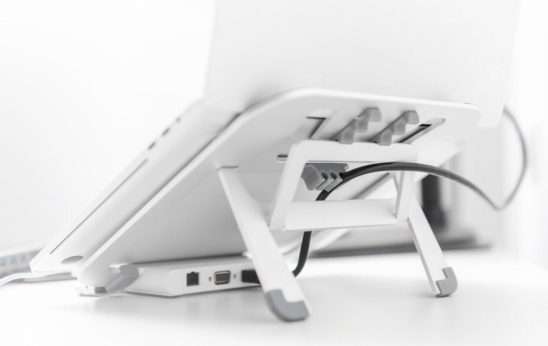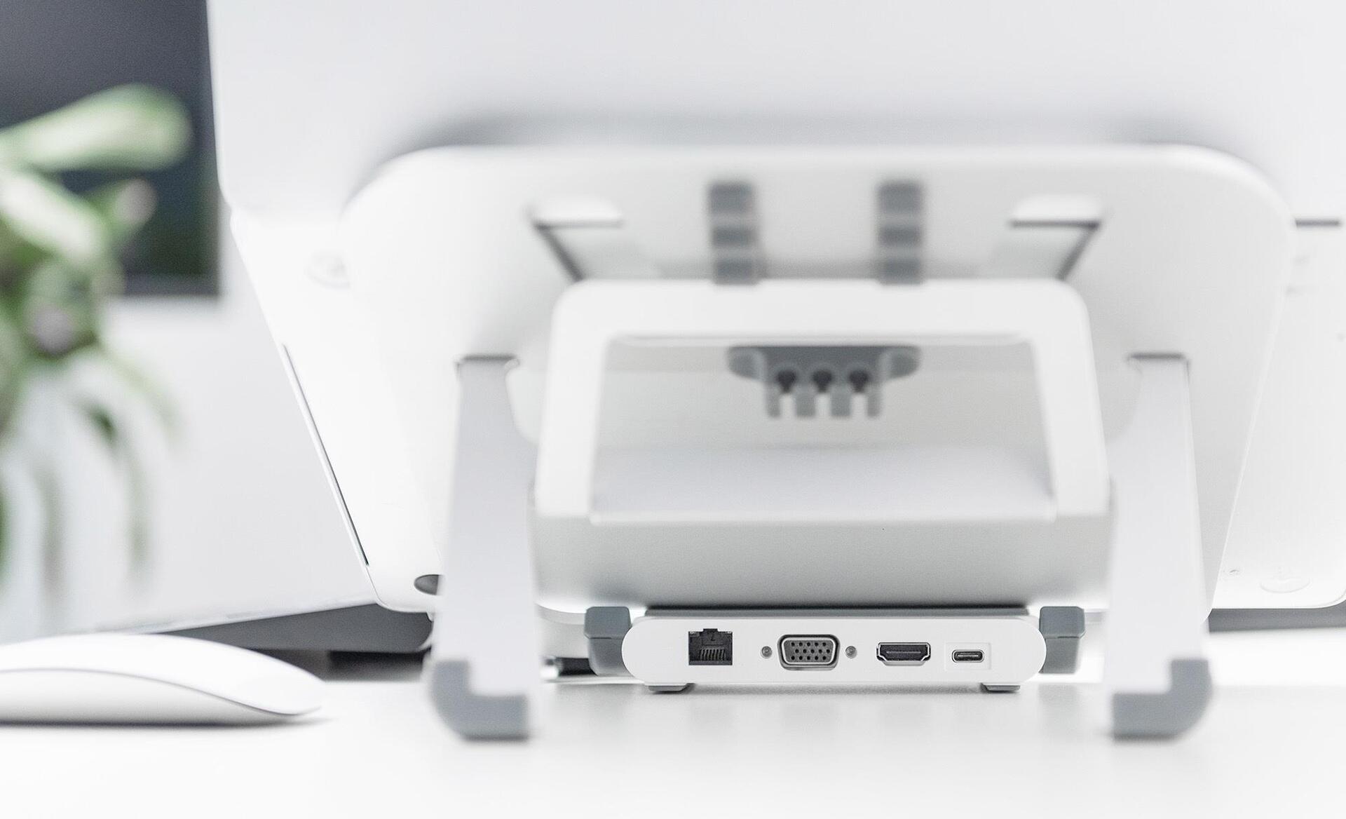 Der verstellbare Notebooksständer von DIGITUS kombiniert Ergonomie und Konnektivität zu einer praktischen Einheit. Spielend leicht können Sie den Neigungswinkel Ihrer Körpergröße in 4 Stufen anpassen. Über den USB-C Port lässt sich Ihr Notebook anschliessen, so haben Zugriff auf sämtliche Schnittstellen der integrierten Docking Station. An der Frontseite befinden sich ein vollfunktionsfähiger USB-C Port, zwei USB A Ports (USB 3.0) und ein Kartenleser für SD- und microSD-Karten. An der Rückseite lassen sich zwei Monitore anschliessen (HDMI + VGA), ein RJ45-Netzwerkkabel (LAN), sowie ein USB-C Netzteil, welches beispielsweise den Ladestrom (Power Delivery) für ein angeschlossenes Notebook liefern kann. Nutzen Sie die Vorteile von Ergonomie und Konnektivität in einer Einheit mit dem DIGITUS Notebook-Ständer mit integrierter Docking Station.
