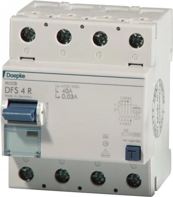 Doepke 09134911. Eingangsspannung: 150 - 250 V, Nennstrom: 40 A. Schutzschaltertyp: Residual-current device, Typ: A-type, Schaltleistung: 10000 A. Breite: 72 mm, Tiefe: 75 mm, Höhe: 85 mm (09134911)