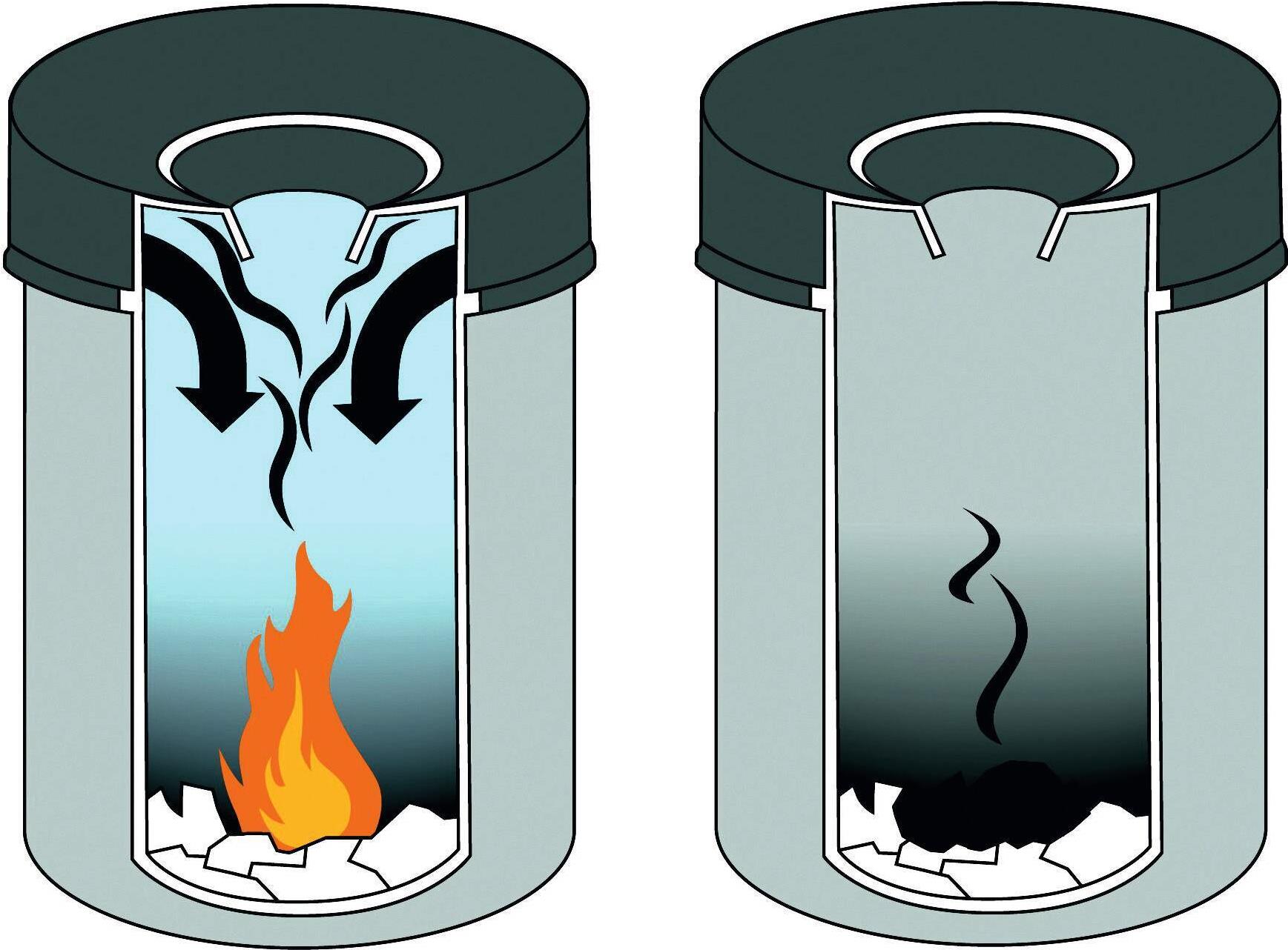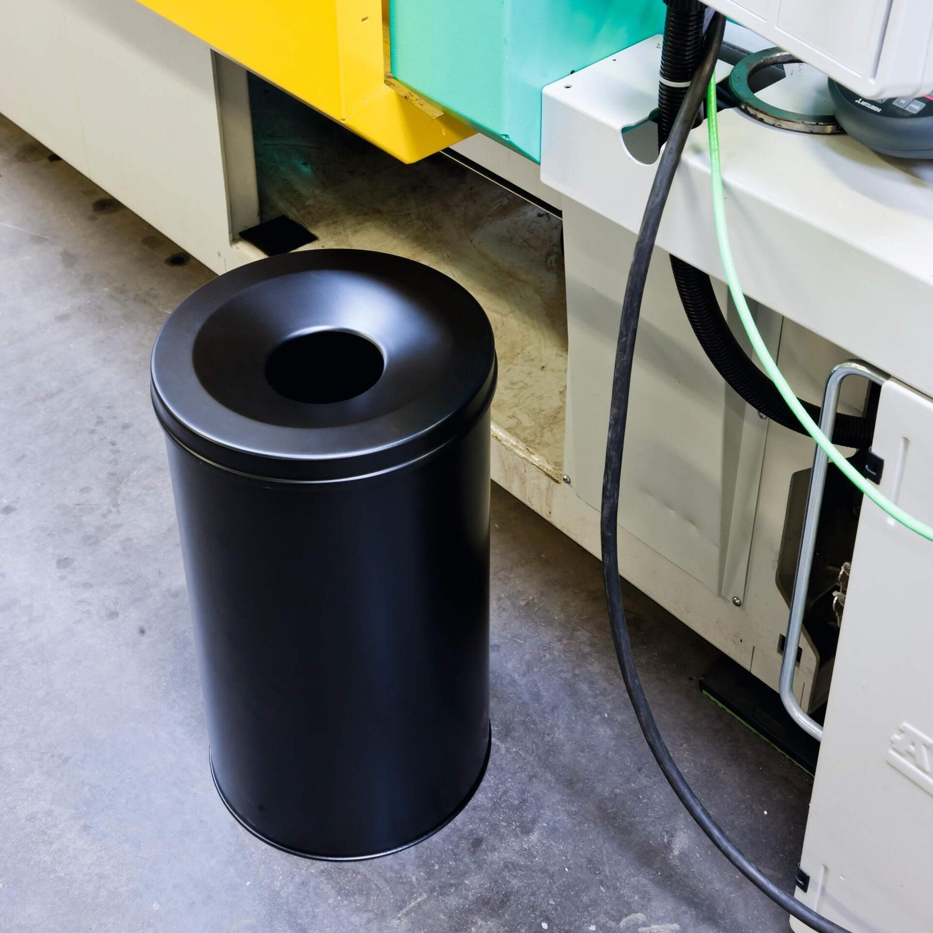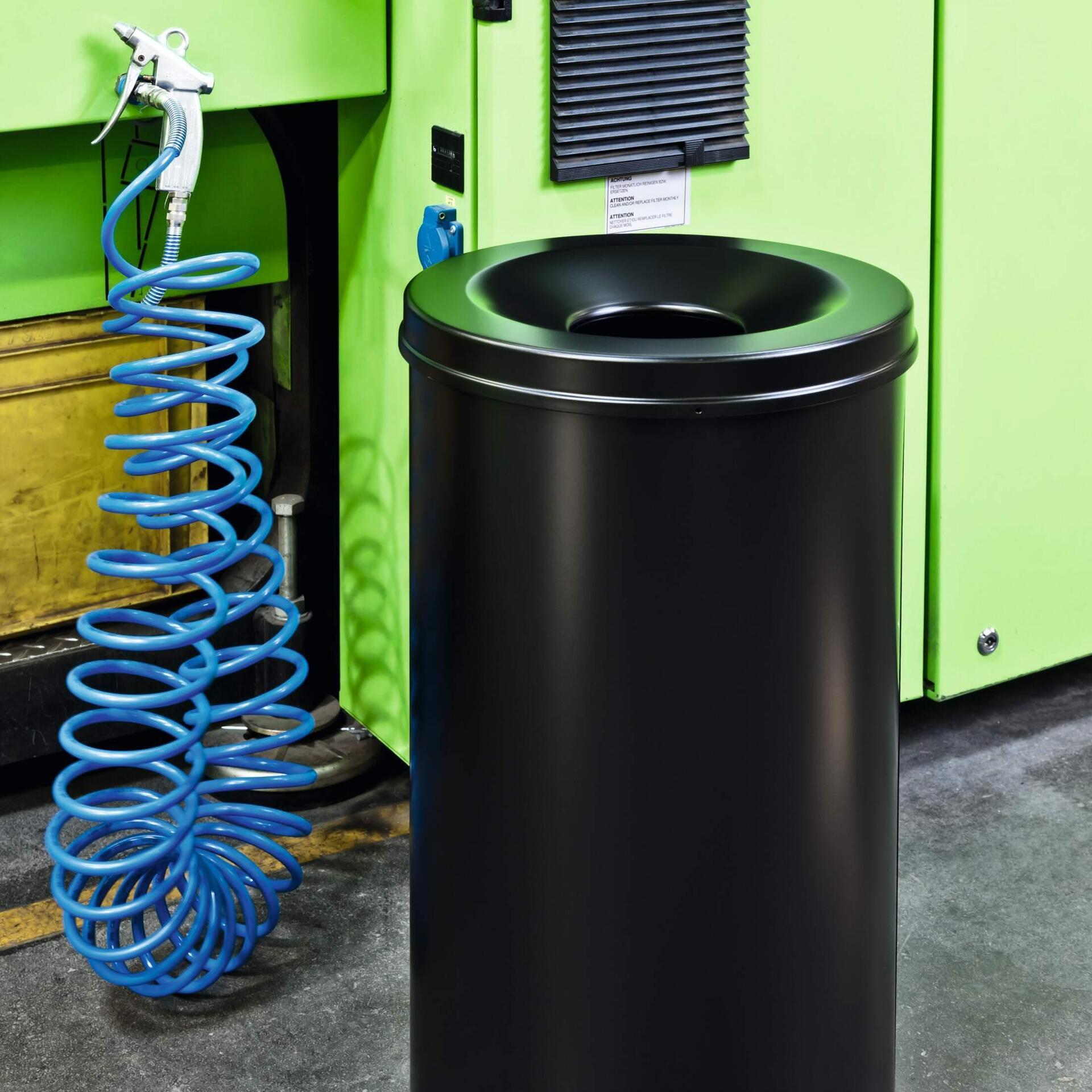 Runder Papierkorb mit Flammenlöschkopf für präventiven Feuerschutz. Der selbstlöschende Deckel unterbricht die Sauerstoffzufuhr im Papierkorb und erstickt die Flammen rechtzeitig. Aus Stahl mit kratzfester ...