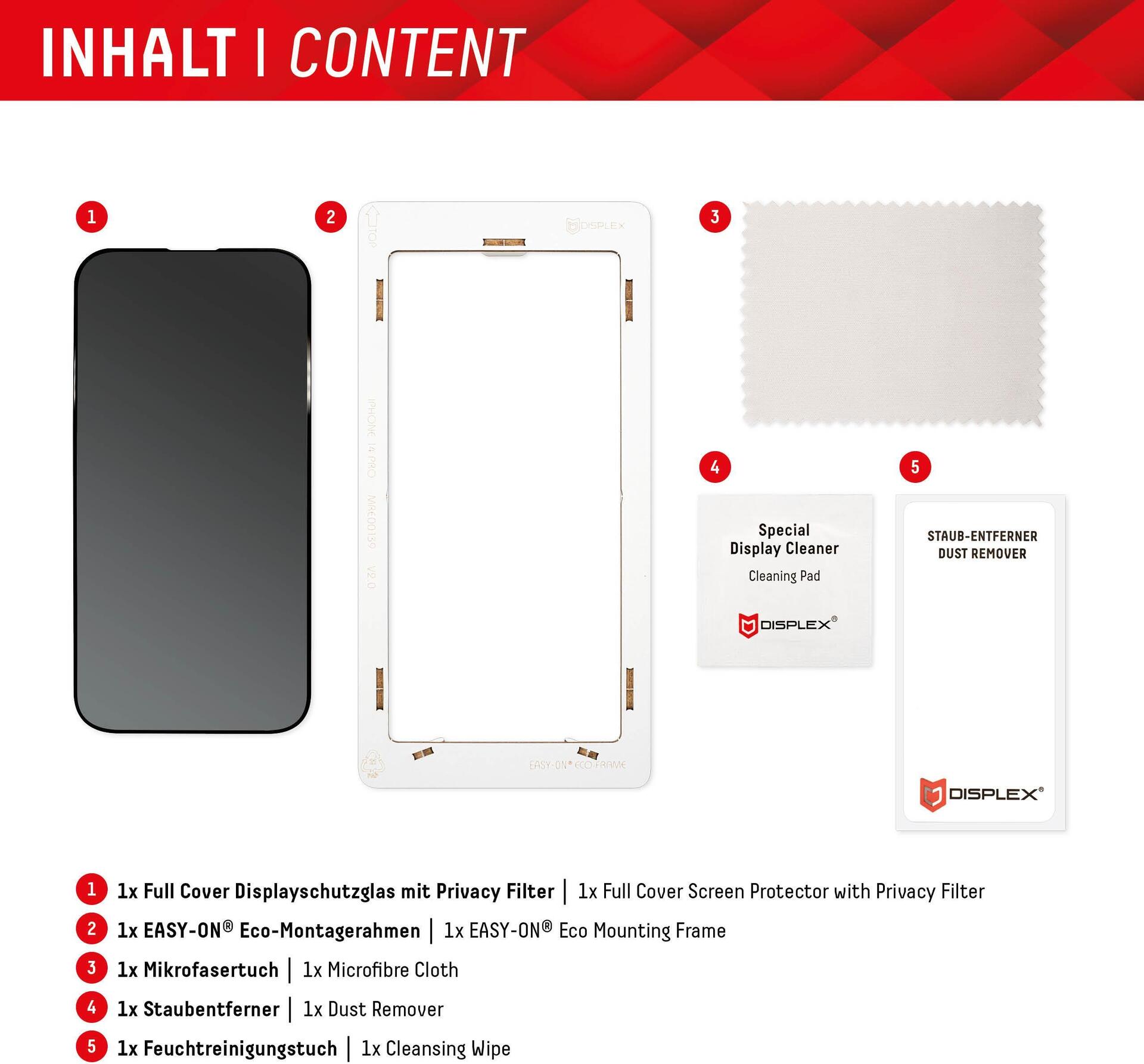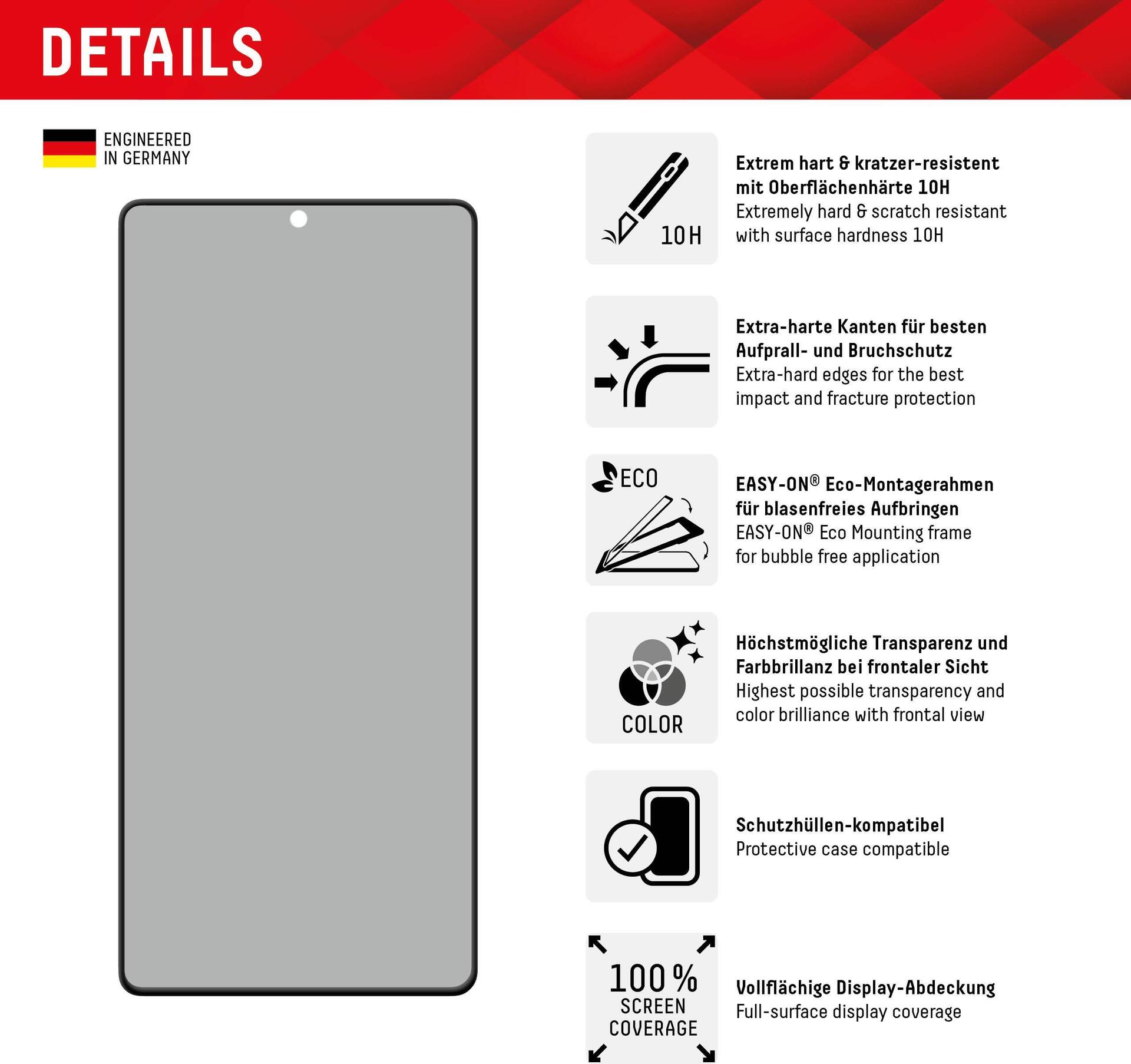 Der Sicherheitsglas-Displayschutz aus gehärtetem, echtem Glas bietet kristallklaren und extrem robusten Schutz vor Kratzern und Stößen. Natürlich glasklar und mit perfektem Touch!Produkttext[/head]PRIVACY Full Cover Real Glass mit EASY-ON® MontagerahmenPrivacy FilterDank dem speziellem Privacy-Filter, der in das Schutzglas integriert ist, wird das Display-Licht nur aus einem bestimmten Blickwinkel durchgelassen. Der integrierte Blickschutzfilter bewirkt, dass das Display-Licht nur bei frontalem Blick auf das Gerät ausgestrahlt wird. Ab einem seitlichen Betrachtungswinkel von 30 Grad bricht die Privacy Filter Protection das Licht, das Display erscheint schwarz. Dadurch bietet das Glas einen effektiven Schutz vor seitlichen Blicken von z.B. Sitznachbarn im Zug, Flugzeug oder Bus. Hinweis: aufgrund des Privacy Filters kann die Fingerprint-Funktion nicht unterstützt werden.Full Cover bzw. 3D/ Curved SchutzglasIm Vergleich zu sogenannten 2D Schutzgläsern decken die Displex Full Cover Panzergläser (3D/ Curved) nicht nur den aktiven, sondern den gesamten Displaybereich ab. Insbesondere bei gewölbten Displays empfehlen wir ein Full Cover Schutzglas (3D/ Curved), da es an die „runden Kanten“ des Smartphone Displays angepasst ist und diese optimal schützt. Das bedeutet maximalen Schutz, optimale Displaynutzung, ohne störende Kanten.Glas- und KantenhärteDas Displex Panzerglas hat einen Härtegrad von 10H und ist damit nicht nur kratz-, bruch-, und stoßfester als vergleichbare Markenprodukte, sondern übertrifft sogar hochwertiges Saphirglas (9H), das bei Luxusuhren eingesetzt wird. Die Kanten, die bruch- und stoßanfälligste Zone des Smartphones und Schutzglases, sind spezialgehärtet, durch eine mehrfache Polierung abgerundet und mit einer Schock-absorbierenden Kante (bei Full Cover Schutzgläsern) veredelt. Durch dieses aufwendige Produktionsverfahren wird das Schutzglas extrem widerstandsfähig gegen Schläge, Stöße und Bruch und ist zugleich besonders angenehm bei der Nutzung.HüllenfreundlichUnser Displex Schutzglas wird bis auf 5/100 mm genau auf die Smartphone Konturen gefertigt und passt somit perfekt auf Ihr Smartphone. Außerdem ist die Schutzfolie ultradünn. Somit lassen sich alle handelsüblichen Schutzhüllen & Cases mit der Panzerglasfolie benutzen. Durch einen kombinierten Schutz aus Displex Tempered Glass und Ihrer Lieblingshülle wird Ihr Smartphone rundum optimal geschützt.Anti FingerprintDie oberste Schicht unserer 5-Layer Technology besteht aus einem High-Tech Plasma Coating. Die hydrophobe Anti-Fingerprint-Beschichtung ist fett- und schmutzabweisend, extrem langanhaltend und gewährleistet optimalen Touch und Scrollen. Durch diese Technologie sieht Ihr Display nicht nur schöner aus, sondern bleibt auch länger sauber und muss somit seltener gereinigt werden.SplitterschutzDer im Real Glass integrierte High-Tech Splitterschutz von Displex gewährleistet absolute Sicherheit, auch beim Bruch des Panzerglases. Durch das Verbundmaterial der zweiten Schicht im Schutzglas splittert dieses nicht und garantiert somit eine absolut sichere Verwendung. Und wenn es doch zum Ernstfall kommen sollte und das Schutzglas einen Schlag, Fall oder Stoß abgefangen hat und gebrochen ist, dann kann das Displex Schutzglas durch den integrierte High-Tech Splitterschutz problemlos in einem Stück vom Display abgezogen werden.Hochleistungs-SilikonNach der Montage des Schutzglases sorgt das Hochleistungs-Silikon für optimale Haft-Eigenschaften und eine klare Optik. Damit die Handy-Schutzfolie langfristig und zuverlässig hält, ist das Silikon auf alle Display-Beschichtungen der verschiedenen Hersteller angepasst. Auch die Optik wird dabei nicht beeinflusst: trotz Displayschutzfolie können Sie packende Videos und Fotos mit maximaler Transparenz und Farbtreue genießen.Einfaches, blasenfreies AufbringenMit dem EASY-ON® Montagerahmen und dem dazugehörigen Video Tutorial gestaltet sich die Montage des Tempered Glass schnell, einfach und exakt. Das Ergebnis: kein schiefes Aufliegen des Screen Protectors auf dem Display, keine verdeckten Öffnungen für Lautsprecher oder Mikrofone und erst recht keine Blasen unter dem Schutzglas.[head]Hauptmerkmale