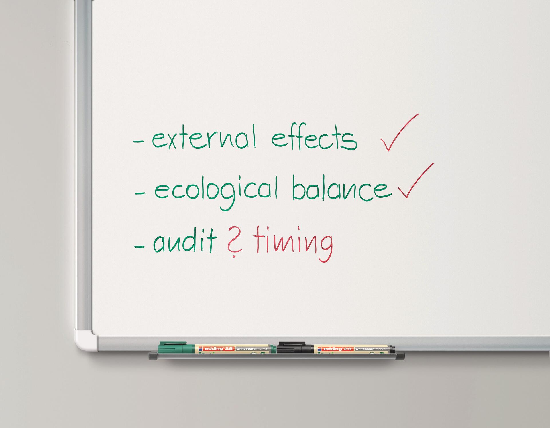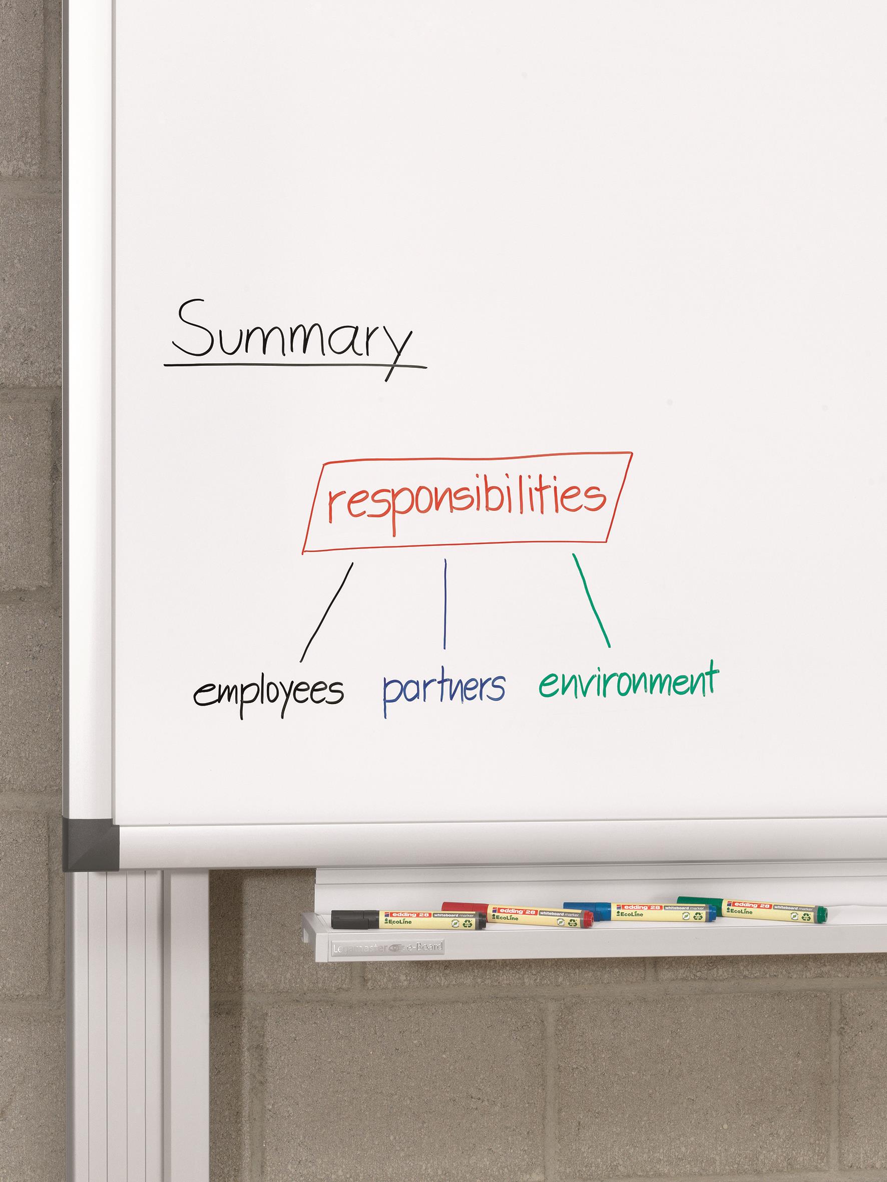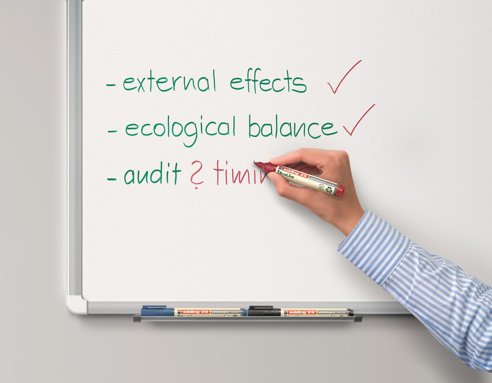Ob im Büro, bei Präsentationen oder Vorlesungen, es fühlt sich immer toll an, der Welt etwas zurückzugeben. Mit dem edding 28 EcoLine Whiteboardmarker ist das besonders leicht, denn mindestens 90% der verwendeten Kunststoffe stammen aus recycelten Materialien. Davon sind 83% sogar Post-Consumer-Kunststoffe wie benutzte Joghurtbecher oder Gießkannen. Der edding 28 EcoLine Whiteboardmarker hat eine Rundspitze und verwendet eine Tinte, die leicht von praktisch allen nichtporösen Oberflächen trocken abwischbar ist.Und wenn die Kappe nach einer lebhaften Präsentation oder einem Vortrag nicht wieder aufgesteckt wird, ist das auch kein Grund zur Sorge. Selbst nach mehreren Tagen trocknet der Marker nicht aus. Er ist nachfüllbar und damit viele Male verwendbar. Das macht ihn nicht nur umweltfreundlich, sondern auch zu einer wirtschaftlichen Lösung für jedes Büro und jede Bildungseinrichtung.Hauptmerkmale