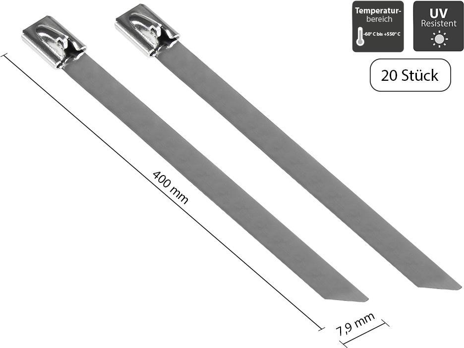 Edelstahl-Kabelbinder 400 mm x 7,9 mm, -60 °C bis +550 °C, 20 Stück, Good Connections (KAB-E40X79)