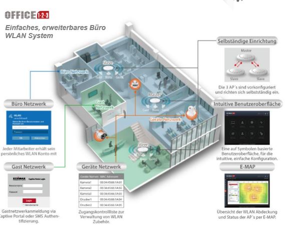 Der zusätzliche Office +1 Access Point für das Office 1-2-3 WLAN-System ist ein vorkonfigurierter Access Point, der mit dem Office 1-2-3 untereinander kommuniziert und sich eigenständig einrichten und verwalten kann.