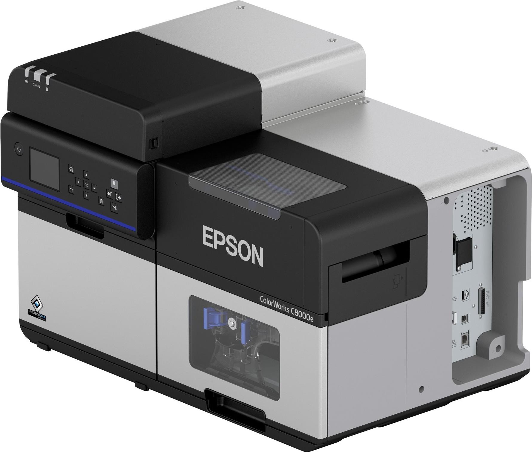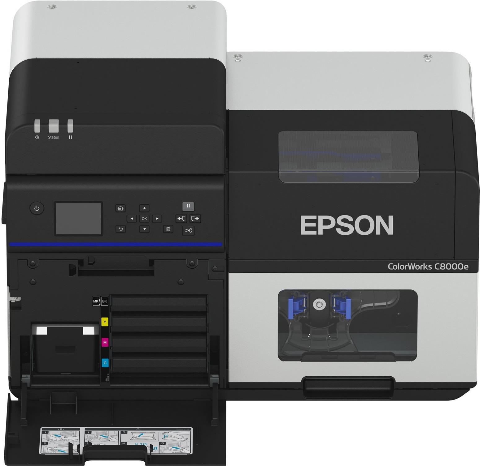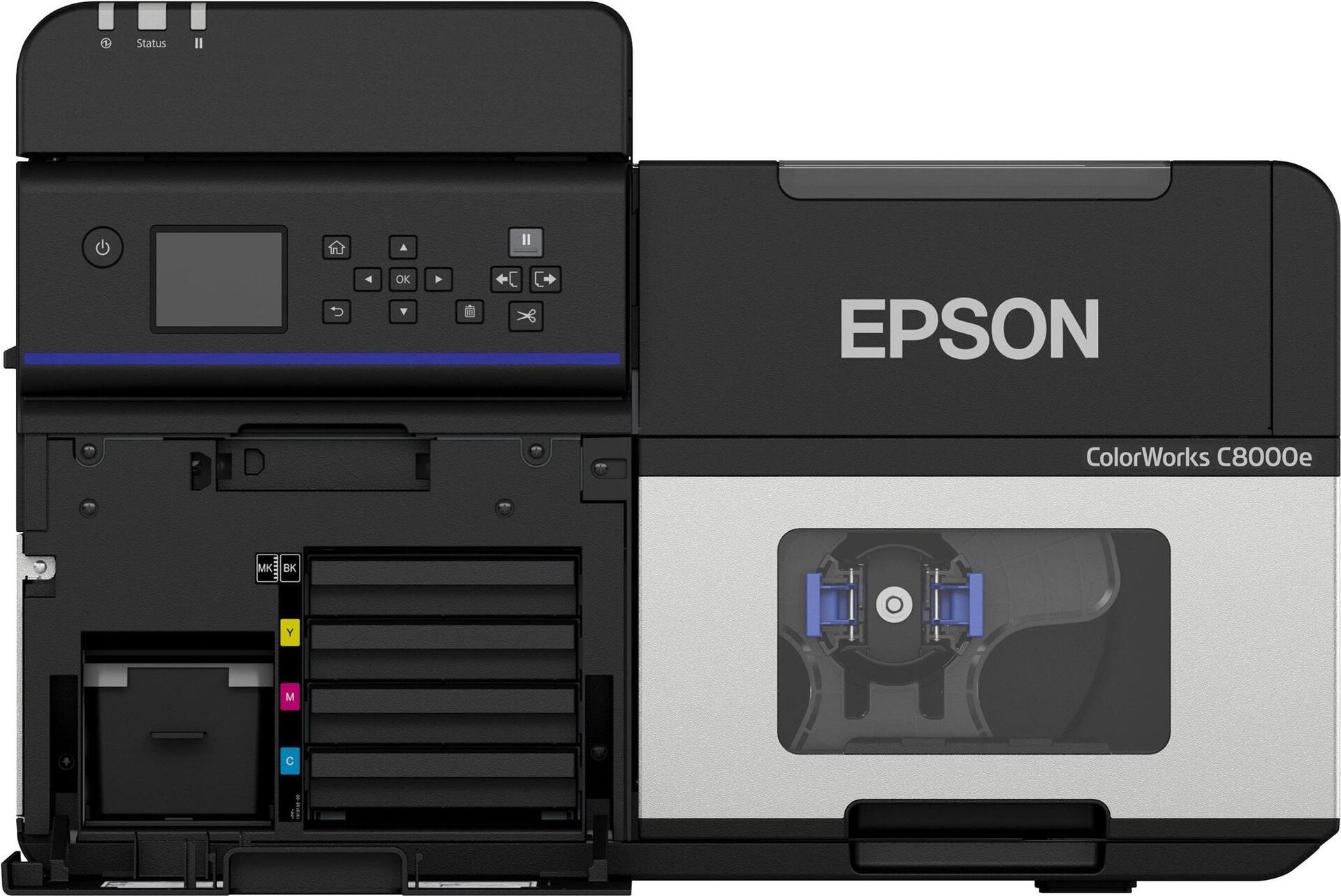 Epson ColorWorks C8000e, matte black ink, Cutter, Disp., USB, Ethernet, Kit (USB), schwarz, grau Farb-Etikettendrucker, Tintenstrahl, Auflösung: 47 Punkte/mm (1200 dpi), Medienbreite (max): 112 mm, Druckbreite (max.): 108 mm, Geschwindigkeit (max.): 300 mm/Sek, Cutter, Display, USB (3.0), Ethernet, inkl.: Kabel (USB), Netzteil, Etikettenrolle, Tintenpatrone, QSG, separat bestellen: Netzkabel, Farbe: schwarz, grau (C31CL02102MK)