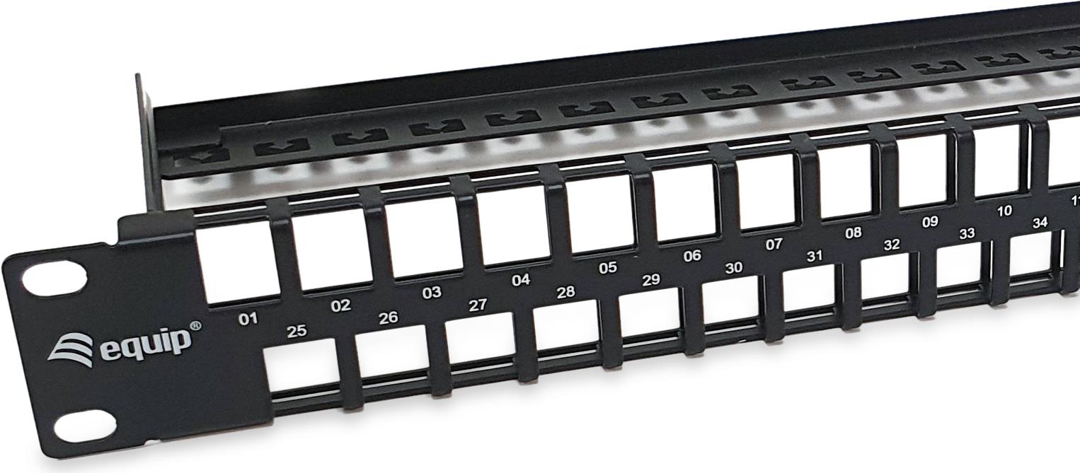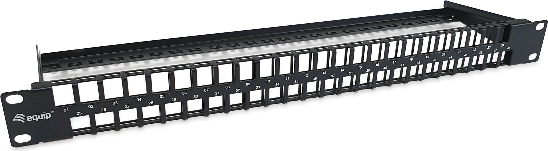 Equip 48-Port Keystone Cat.6 Ungeschirmtes Patchpanel, Schwarz. Stecker: RJ-45, unterstütze Kabeltypen: Cat6. Produktfarbe: Schwarz, Material: Stahl, Rack-Kapazität: 1U. Breite: 482,6 mm, Höhe: 126,4 mm, Tiefe: 44,5 mm. Verpackungsbreite: 500 mm, Verpackungstiefe: 150 mm, Verpackungshöhe: 55 mm. Ursprungsland: China, Breite des Versandkartons: 515 mm, Länge des Versandkartons: 290 mm (769258)