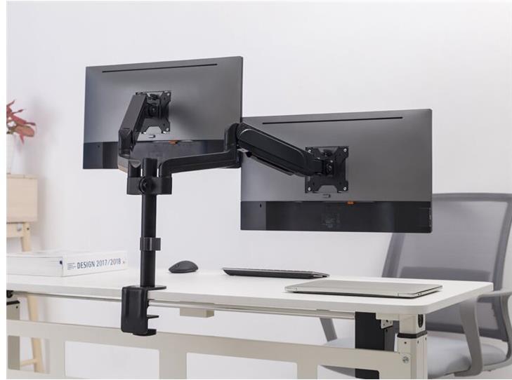Die equip 17"-32" Dual-Monitor-Tischhalterung mit Gasfederstruktur ist eine dynamische Lösung zur Aufwertung Ihres Arbeitsplatzes. Diese Halterung ist für die Aufnahme von zwei Monitoren mit einer Größe von 17 bis 32 Zoll konzipiert und verfügt über ein benutzerfreundliches Gasfedersystem, das mühelose Höhenverstellung, Neigungswinkel, Schwenkung und Drehung ermöglicht. Dadurch können Sie Ihre Monitore einfach positionieren, um ergonomischen Komfort und optimale Betrachtungswinkel zu gewährleisten.Die Gasfederstruktur sorgt für sanfte und flüssige Bewegungen und fördert schnelle Übergänge zwischen Sitz- und Stehposition. Diese Halterung maximiert nicht nur den Platz auf dem Schreibtisch, sondern trägt auch dazu bei, die Belastung von Nacken, Augen und Rücken zu reduzieren. Es ist eine ausgezeichnete Wahl für Büros, Heimarbeitsplätze und kreative Einrichtungen. Das integrierte Kabelmanagementsystem sorgt für organisierte Kabel und sorgt so für einen aufgeräumten Arbeitsplatz. Mit seiner Kompatibilität, den einstellbaren Funktionen und dem innovativen Gasfederdesign steigert diese Tischhalterung für zwei Monitore sowohl die Produktivität als auch das Wohlbefinden.