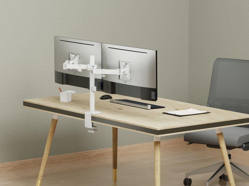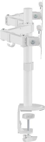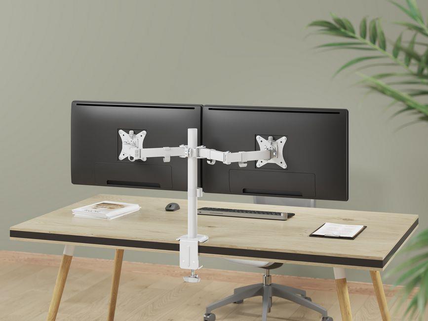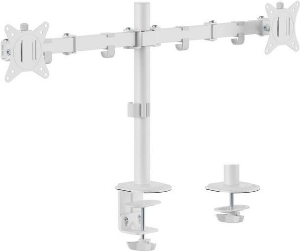 Die Equip 650167 Dual-Monitor-Tischhalterung ist eine vielseitige Montagelösung für Monitore mit einer Größe zwischen 17 Zoll und 32 Zoll (Ihr LCD/LED-Monitor). Es bietet eine einstellbare Artikulation, sodass Sie Ihren Monitor für ergonomische Betrachtungspositionen neigen, schwenken und drehen können.Die Halterung wurde entwickelt, um Platz auf dem Schreibtisch freizugeben und eine optimierte Einrichtung zu ermöglichen. Seine langlebige Konstruktion gewährleistet Stabilität und Halt für Ihren Monitor. Mit seiner weißen Oberfläche verleiht es Ihrem Arbeitsplatz eine moderne Note. Diese Dual-Tischhalterung ist einfach zu installieren und verfügt über Kabelmanagementfunktionen. Sie eignet sich ideal für die Schaffung einer komfortablen und organisierten Arbeitsumgebung.Ein praktischer Telefonsteckplatz befindet sich an der Basis. Eine abnehmbare VESA-Platte für eine benutzerfreundliche Installation.