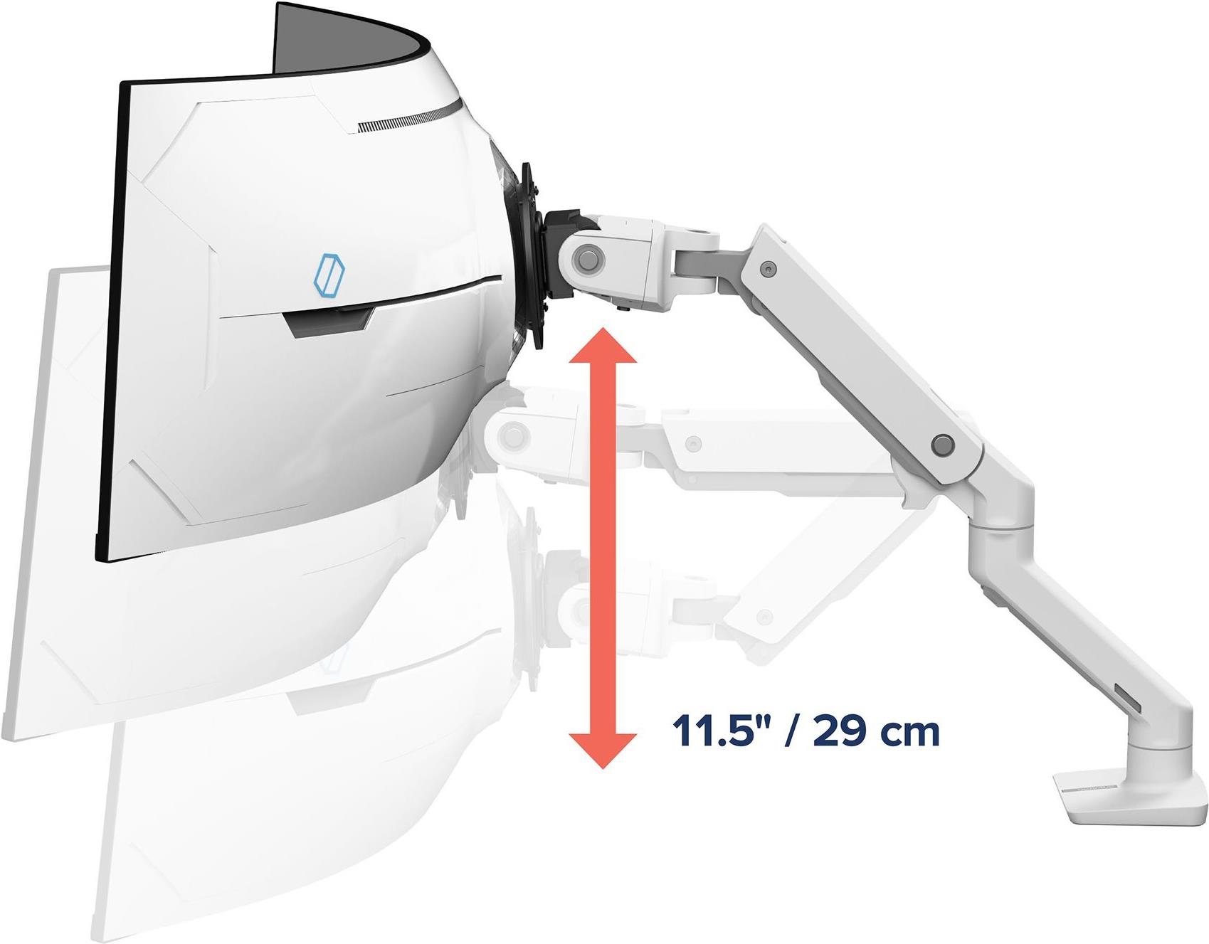 Erleben Sie Vielseitigkeit mit einstellbaren Funktionen wie 25° Neigung, 180° Schwenkung und 20° Drehung. Die Hubhöhe von 29,2 cm ermöglicht einen einfachen Zugriff auf das Display, sodass es sich für verschiedene Betrachtungspositionen eignet. Das tischmontierbare Design umfasst eine Tischklemme, eine Tüllenhalterung und eine Verlängerung für verschiedene Arbeitsplatzkonfigurationen.