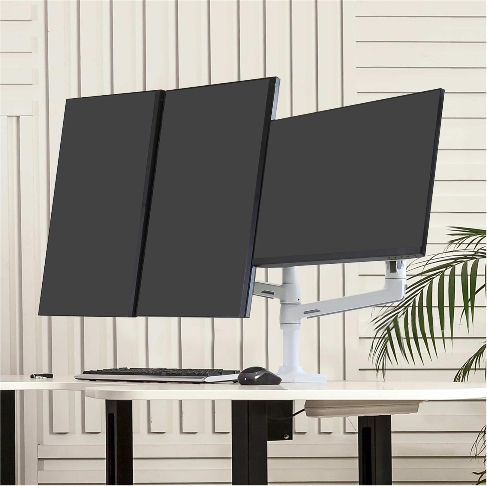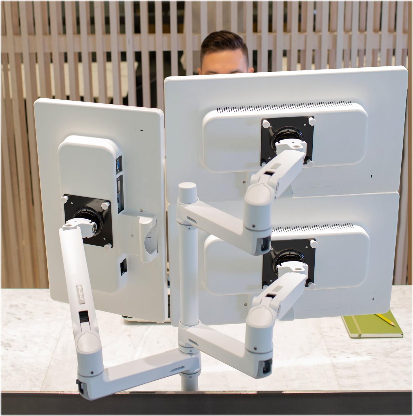 Bauen Sie einen vorhandene LX-Arm so um, dass er zwei, drei oder vier Monitore aufnehmen kann, wodurch eine gestapelte Multi-Monitorkonfiguration entsteht. Dieser Montagesatz kann ganz einfach an der Säule des Tisch-Montagefußes angebracht werden.
