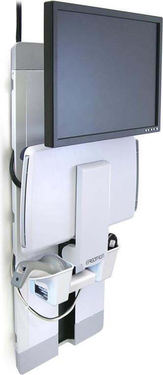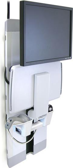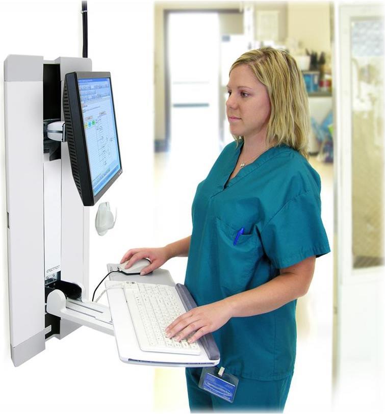 Durch den geringen Wandabstand ist Vertical Lift ideal für Behandlungszimmer mit begrenzten Platzverhältnissen. Vertical Lift ermöglicht eine vertikale Anpassung um 23 cm und lässt sich mühelos zu einer schlanken und kompakten Einheit zusammenklappen, wenn es nicht gebraucht wird. Die ausziehbare und negativ neigbare Tastaturablage sorgt für mehr Komfort, während die Schwenkfunktion für Monitor und Tastatur zu einer besseren Interaktion zwischen Patienten und medizinischem Personal beiträgt.