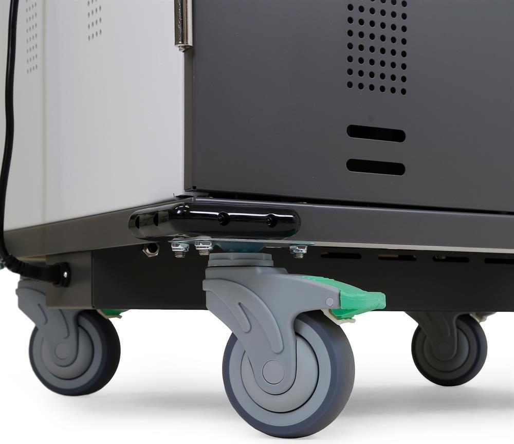 Der netzwerkfähige Ladewagen transportiert, sichert und lädt 36 Chromebooks. Um ein zusätzliches Maß an Sicherheit zu gewährleisten, verfügt jede Tür über Verschlüsse zur Aufnahme eines eigenen Vorhängeschlosses. Wenn es installiert ist, schränkt Ihr Vorhängeschloss den Zugang zum Griff ein, so dass das Gerät nicht geöffnet werden kann.