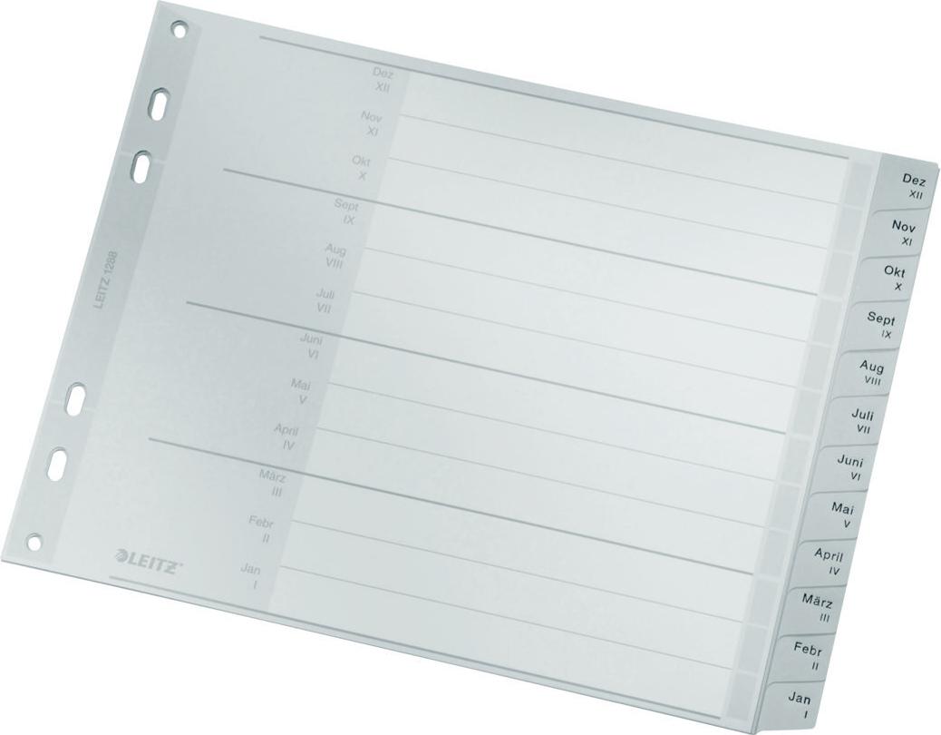 LEITZ Kunststoff-Register, Monate, A4 Überbreite, Dez.-Jan. grau, PP, Halbe Höhe, 12-teilig, 0,12 mm, Dezember - Januar, mit beschriftbarem Deckblatt aus Karton (250 g/qm), bedruckte Taben, Premium-Ausführung, Eurolochung, Maße: (B)238 x (H)180 mm (1288-00-85)
