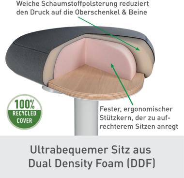 Der Leitz Ergo Active Sitzhocker verfügt über einen einzigartigen Dual Density Foam (DDF) Komfortsitz mit festem ergonomischen Stützkern. Ähnlich wie bei einem Sattelhocker verteilt die dreieckige Form das Gewicht gleichmäßig auf das Becken. Dank der besonders weichen Schaumstoffpolsterung um den Stützkern herum wird der Druck auf die Oberschenkel und Beine verringert. Die 9 cm dicke Sitzfläche ist auf Komfort ausgelegt und kann sowohl zum Sitzen als auch zum Anlehnen verwendet werden, was zu einer aufrechteren Sitzhaltung anregt und ein äußerst bequemes Sitzerlebnis ähnlich wie bei einem Sitzkissen bietet. Dieser in Zusammenarbeit mit dem Institut für Gesundheit und Ergonomie (IGR) entwickelte, höhenverstellbare ergonomische Bürohocker wurde entwickelt, um Sie beim Sitzen an Ihrem Schreibtisch zu Hause oder bei der Arbeit aktiv zu halten. Der abgerundete Sockelfuß des Schreibtischhockers regt zu aktiver Bewegung und dynamischem Sitzen an, da er während der Arbeit wippt und schwenkt. Das stärkt den Rücken und die Körpermitte und beugt Schmerzen vor. Leichtgängige und einfache Höhenverstellung um 17 cm (47 - 64 cm) durch Drücken des Knopfes unterhalb des Sitzes, um die perfekte Sitzhöhe einzustellen. Der Sitzbezug besteht zu 100 % aus recyceltem Material und die rutschfeste Gummiunterfläche des Sockels verhindert das Verrutschen des Hockers und schützt gleichzeitig Ihre Böden. Dank des geringen Gewichts und des Tragegriffs an der Unterseite des Sitzes lässt sich der ergonomische Hocker leicht von Raum zu Raum transportieren und kann problemlos unter einem Schreibtisch verstaut werden. Dieser moderne und minimalistische Sitzhocker ist ideal für Ihr Zuhause oder Büro, um den Komfort zu erhöhen und die Produktivität zu maximieren. Wir haben es uns zur Aufgabe gemacht, Lösungen anzubieten, die es jedem ermöglichen, bei der Arbeit und darüber hinaus erfolgreich zu sein und sich wohl zu fühlen. Kombinieren Sie den höhenverstellbaren Sitzhocker mit vielen anderen Leitz Ergo Produkten, um einen flexiblen Arbeitsplatz zu gestalten, der Ihnen den regelmäßigen Wechsel zwischen Sitzen, Stehen und Bewegen ermöglicht. Bleiben Sie aktiv - FEEL GOOD mit Leitz.