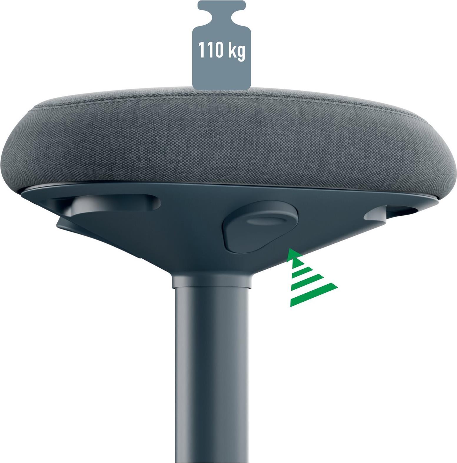 Der Leitz Ergo Active Sitzhocker verfügt über einen einzigartigen Dual Density Foam (DDF) Komfortsitz mit festem ergonomischen Stützkern. Ähnlich wie bei einem Sattelhocker verteilt die dreieckige Form das Gewicht gleichmäßig auf das Becken. Dank der besonders weichen Schaumstoffpolsterung um den Stützkern herum wird der Druck auf die Oberschenkel und Beine verringert. Die 9 cm dicke Sitzfläche ist auf Komfort ausgelegt und kann sowohl zum Sitzen als auch zum Anlehnen verwendet werden, was zu einer aufrechteren Sitzhaltung anregt und ein äußerst bequemes Sitzerlebnis ähnlich wie bei einem Sitzkissen bietet. Dieser in Zusammenarbeit mit dem Institut für Gesundheit und Ergonomie (IGR) entwickelte, höhenverstellbare ergonomische Bürohocker wurde entwickelt, um Sie beim Sitzen an Ihrem Schreibtisch zu Hause oder bei der Arbeit aktiv zu halten. Der abgerundete Sockelfuß des Schreibtischhockers regt zu aktiver Bewegung und dynamischem Sitzen an, da er während der Arbeit wippt und schwenkt. Das stärkt den Rücken und die Körpermitte und beugt Schmerzen vor. Leichtgängige und einfache Höhenverstellung um 17 cm (47 - 64 cm) durch Drücken des Knopfes unterhalb des Sitzes, um die perfekte Sitzhöhe einzustellen. Der Sitzbezug besteht zu 100 % aus recyceltem Material und die rutschfeste Gummiunterfläche des Sockels verhindert das Verrutschen des Hockers und schützt gleichzeitig Ihre Böden. Dank des geringen Gewichts und des Tragegriffs an der Unterseite des Sitzes lässt sich der ergonomische Hocker leicht von Raum zu Raum transportieren und kann problemlos unter einem Schreibtisch verstaut werden. Dieser moderne und minimalistische Sitzhocker ist ideal für Ihr Zuhause oder Büro, um den Komfort zu erhöhen und die Produktivität zu maximieren. Wir haben es uns zur Aufgabe gemacht, Lösungen anzubieten, die es jedem ermöglichen, bei der Arbeit und darüber hinaus erfolgreich zu sein und sich wohl zu fühlen. Kombinieren Sie den höhenverstellbaren Sitzhocker mit vielen anderen Leitz Ergo Produkten, um einen flexiblen Arbeitsplatz zu gestalten, der Ihnen den regelmäßigen Wechsel zwischen Sitzen, Stehen und Bewegen ermöglicht. Bleiben Sie aktiv - FEEL GOOD mit Leitz.