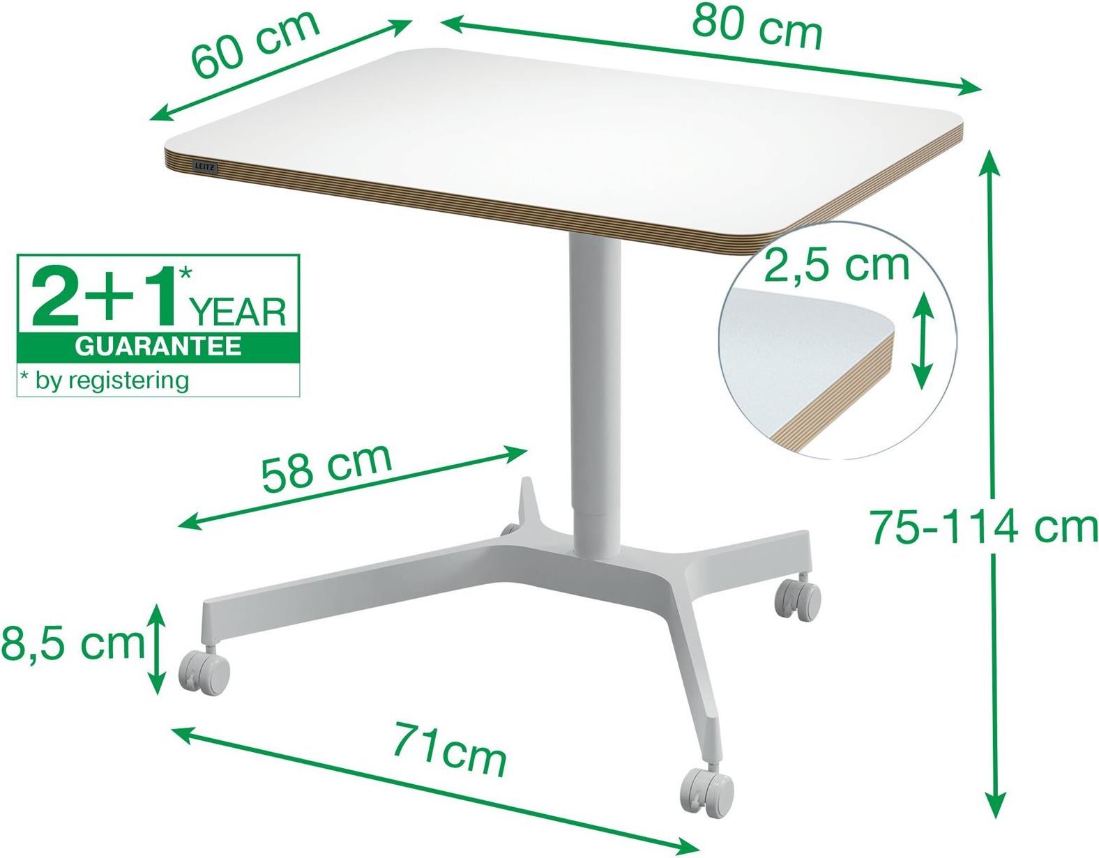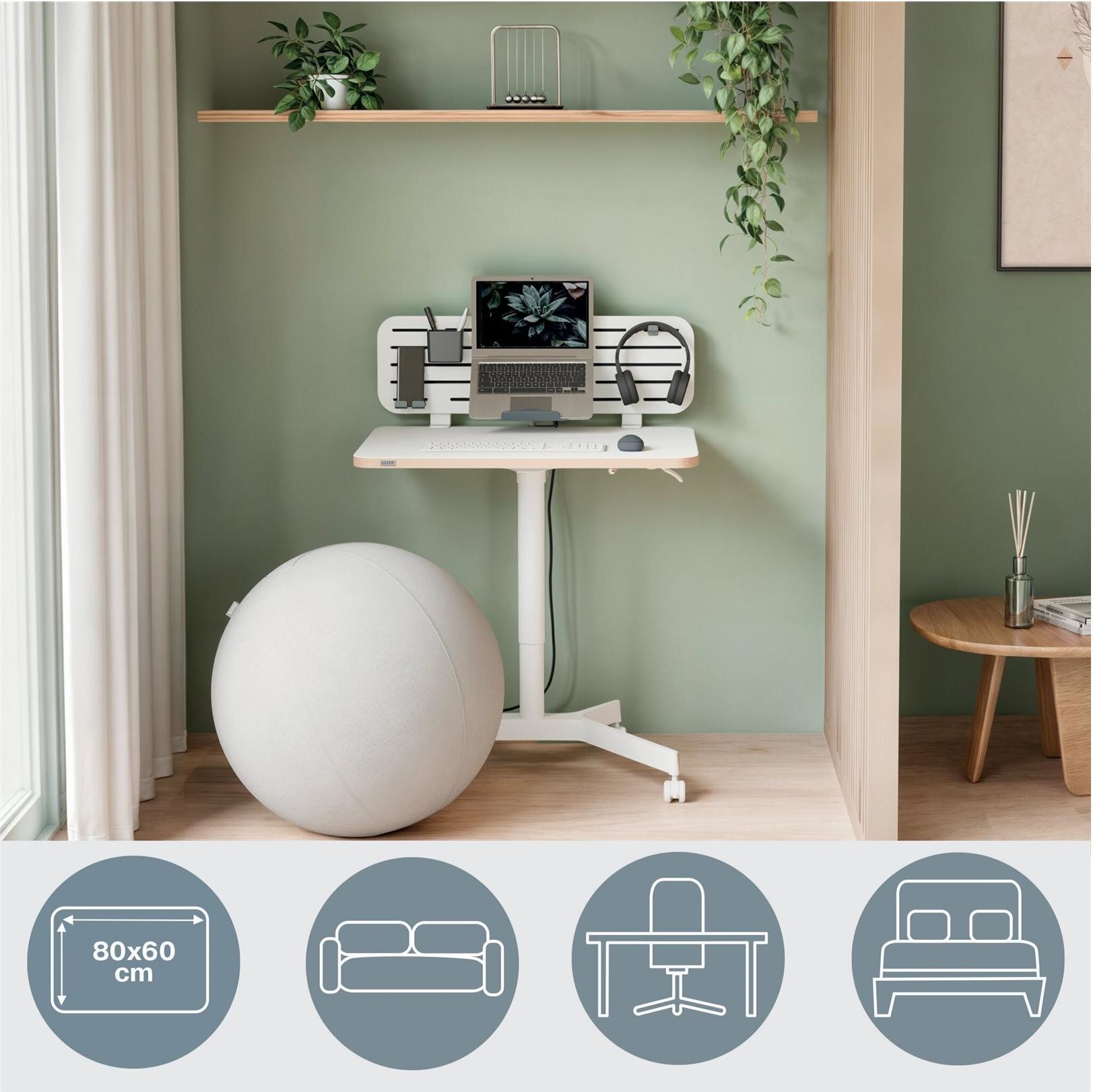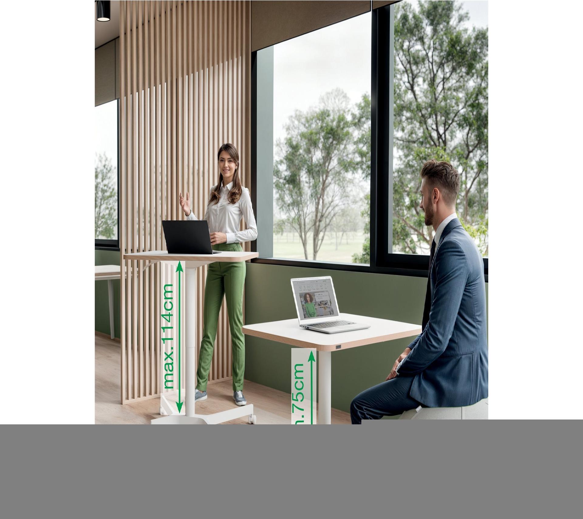 Sitzen - Stehen - Bewegen. Ganz gleich, ob Sie einen gesünderen Lebensstil anstreben oder Schmerzen bei der Arbeit vermeiden möchten, der platzsparende mobile höhenverstellbare Sitz-Steh-Schreibtisch wird Ihren Arbeitsplatz auf das nächste Level bringen. Das kompakte Design mit einer Arbeitsfläche von 80 x 60 cm ist ideal für den flexiblen Einsatz und als temporärer Schreibtisch bei eingeschränkten Platzverhältnissen. Er eignet sich perfekt als kleiner Schreibtisch für das Home-Office oder für Hot Desking-Bereiche in Büros und bietet Platz für einen Laptop, eine Tastatur und weiteres Zubehör wie z. B. Handgelenkstützen und Mauspads. Kombiniert mit den cleveren Leitz Ergo Pegboard Organizern (separat erhältlich) schaffen Sie vertikalen Stauraum und sorgen für Ordnung auf Ihrem Schreibtisch. Dieser Schreibtisch verfügt über eine stufenlose pneumatische Höhenverstellung, mit der Sie die perfekte ergonomische Position finden können. IGR- und TÜV-zertifiziert. Der einfache Wechsel zwischen Sitzen und Stehen fördert die Muskelbewegung, was einen positiven Einfluss auf das Wohlbefinden haben kann. Dank der 4 feststellbaren Rollen lässt sich der Schreibtisch bei Bedarf leicht bewegen. Dieser moderne und minimalistische Sitz-/Steh-Schreibtisch ist ideal für Ihr Zuhause oder Ihr Büro, um den Komfort zu erhöhen und die Produktivität zu maximieren. Wir haben es uns zur Aufgabe gemacht, Lösungen anzubieten, die es jedem ermöglichen, bei der Arbeit und darüber hinaus erfolgreich zu sein und sich wohlzufühlen. Kombinieren Sie den höhenverstellbaren Sitz-/Steh-Schreibtisch mit vielen anderen Leitz Ergo Produkten, um einen flexiblen Arbeitsplatz zu gestalten, der Ihnen den regelmäßigen Wechsel zwischen Sitzen, Stehen und Bewegen ermöglicht. Bleiben Sie aktiv - FEEL GOOD mit Leitz.