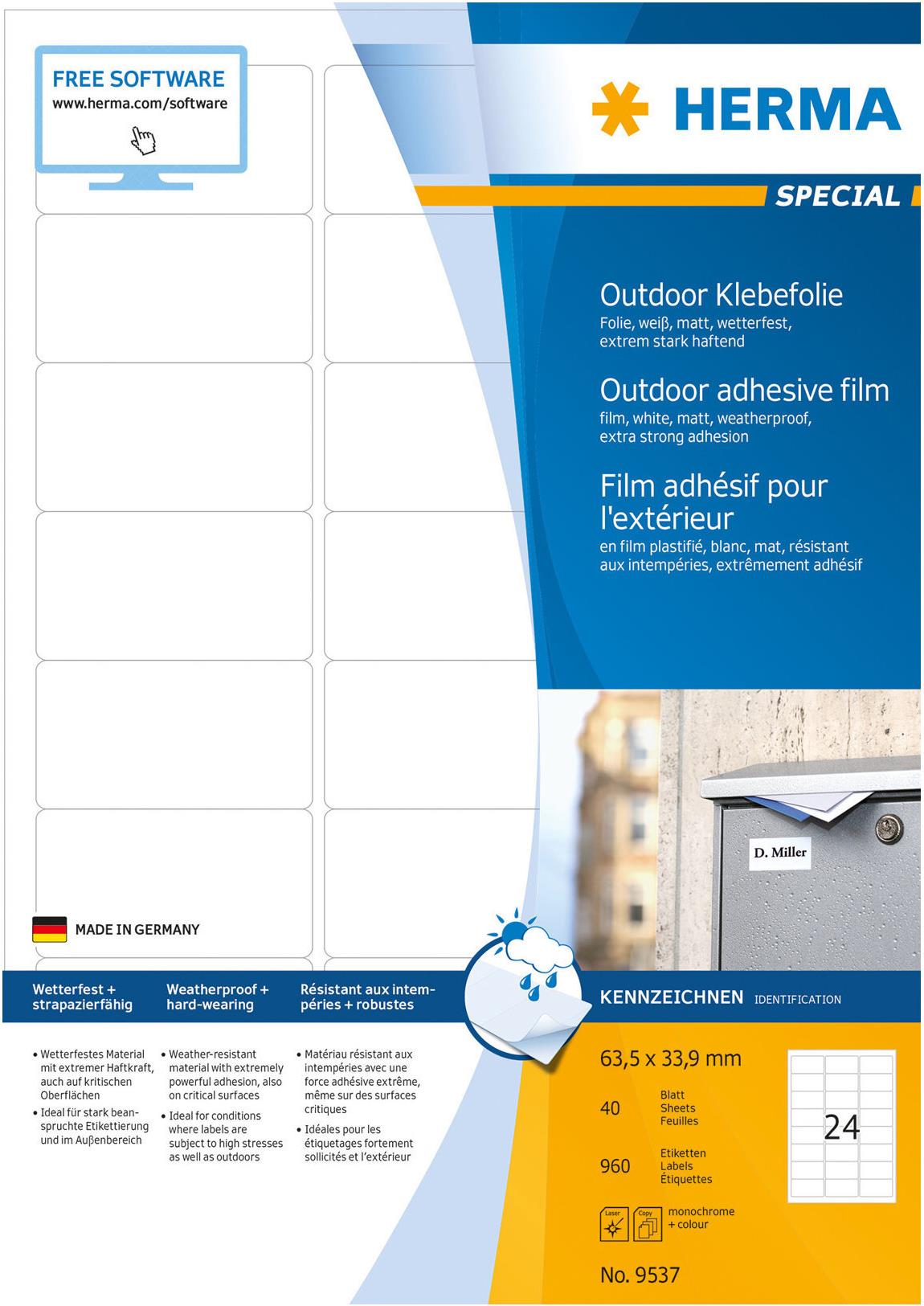 HERMA Special - Polyethylen (PE) - matt - extra strong self-adhesive - weiß - 63,5 x 33,9 mm 960 Etikett(en) (40 Bogen x 24) Folienetiketten (9537)