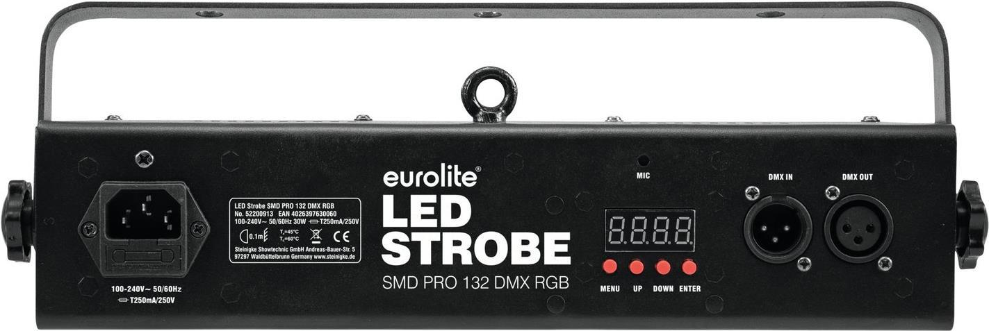 EUROLITE LED Strobe PRO 132 DMX RGB3 Effekte in einem Gerät: Stroboskop, Blinder und Washlight132 SMD-RGB-LEDs, je 0,2 W starkAuto-, Musik-, Master/Slave- und DMX-ModusStufenlose RGB-Farbmischung und FarbwechselDer LED Strobe S