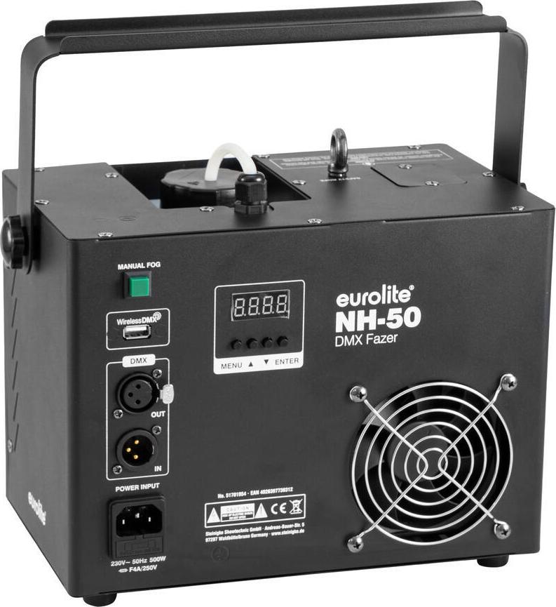 | Achtung: Nur wasserbasierte Nebel-Flüssigkeit verwenden. Gerät nicht wasserdicht (IP20). Vor Überhitzung schützen. Sicherung nur durch Fachpersonal austauschen. | |