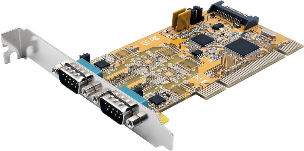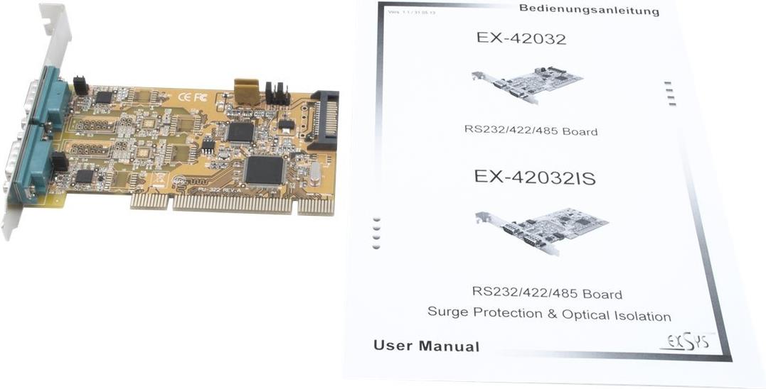 Die EX-42032 PCI I/O Karte stellt zwei serielle RS-232, 422 und 485 High Performance UART 16C550 Ausgänge zur Verfügung. Sie ist entwickelt worden, um zwei weitere Serielle Ports für PC, kleine Workstation oder Server über den PCI- oder PCI-X Bus zu erweitern. +5V und +12V sind auf Pin 9 der seriellen Steckers als POS System (Power over System) konfigurierbar. Die Karte ist voll Plug-and-Play kompatibel.