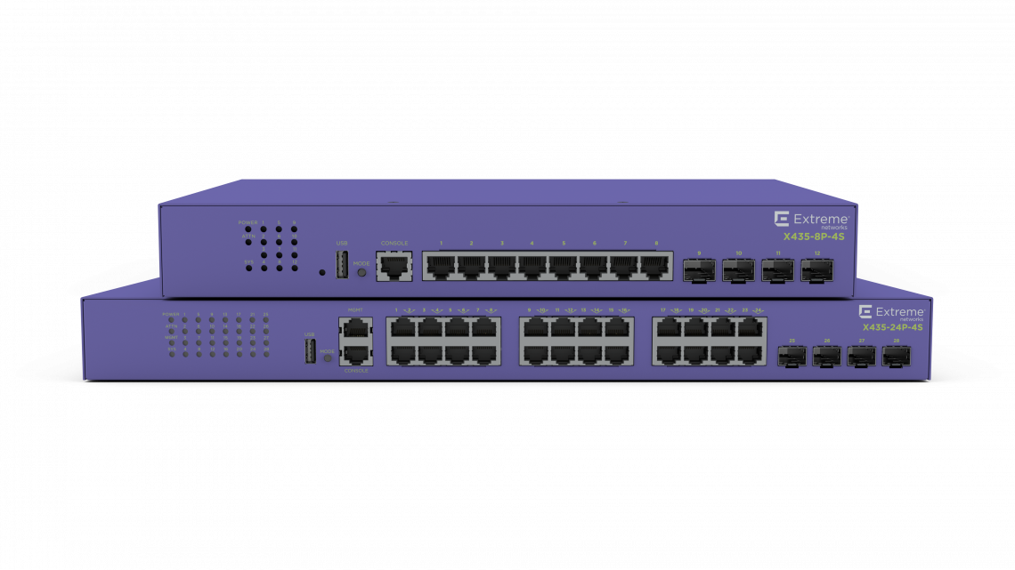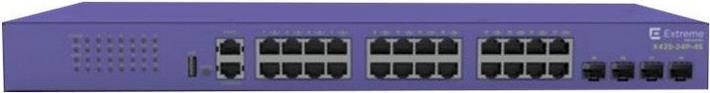 Extreme Networks Appliance 24 10/100/1000BASE-T PoE+w/ half duplex (370w PoE Budget), 4 1/2.5G unpopulated SFP 1 AC PSU, ExtremeXOS Value Edge license (X435-24P-4S)