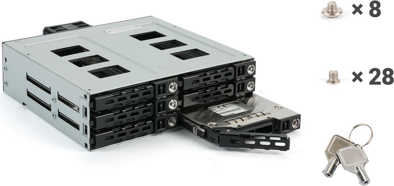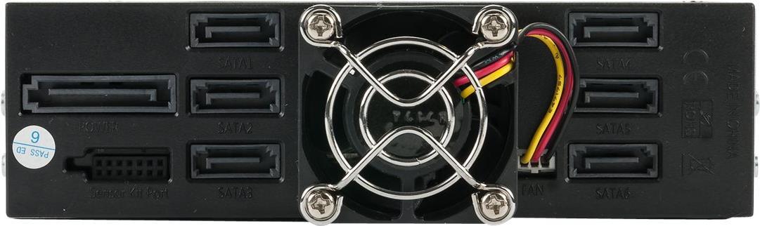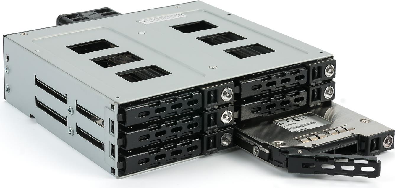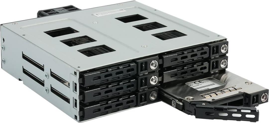 SAS 12G + SATA 6G Backplane für 6x 2,5\" HDD oder SSD (max. Bauhöhe 9,5mm) in einem 5,25\" Einschub. Mit einem 40mm Lüfter an der Rückseite. Festplattenträger.
