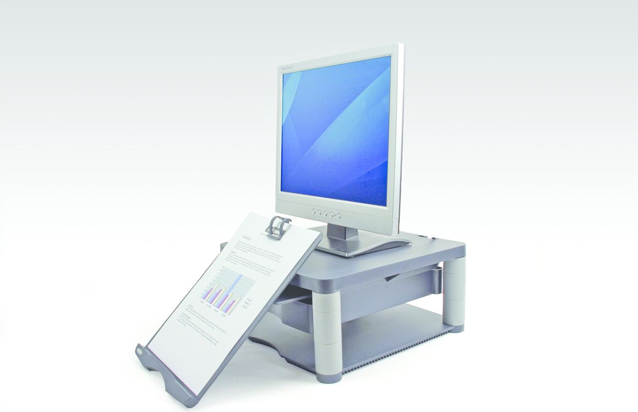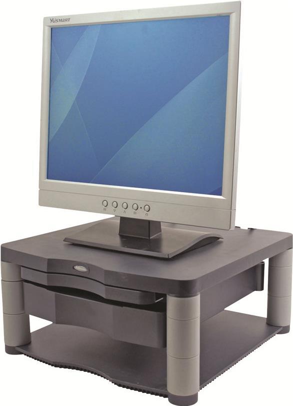 Dieser Monitorständer ist geeignet für herkömmliche sowie Flachbildschirme bis zu einer Größe von 53,3cm (21") oder max. 36kg Gewicht. Der durch FIRA zertifizierte Ständer bringt den Bildschirm auf eine angenehme Sichthöhe und ermöglicht zudem eine bessere Organisation des Arbeitsplatzes. In der 51mm hohen Schublade lassen sich Büroutensilien bequem verstauen. Der eingebaute Konzepthalter ermöglicht eine komfortable Vorlagenpositionierung. Der Monitorständer ist in 5 Stufen höhenverstellbar zwischen 64mm und 165mm.