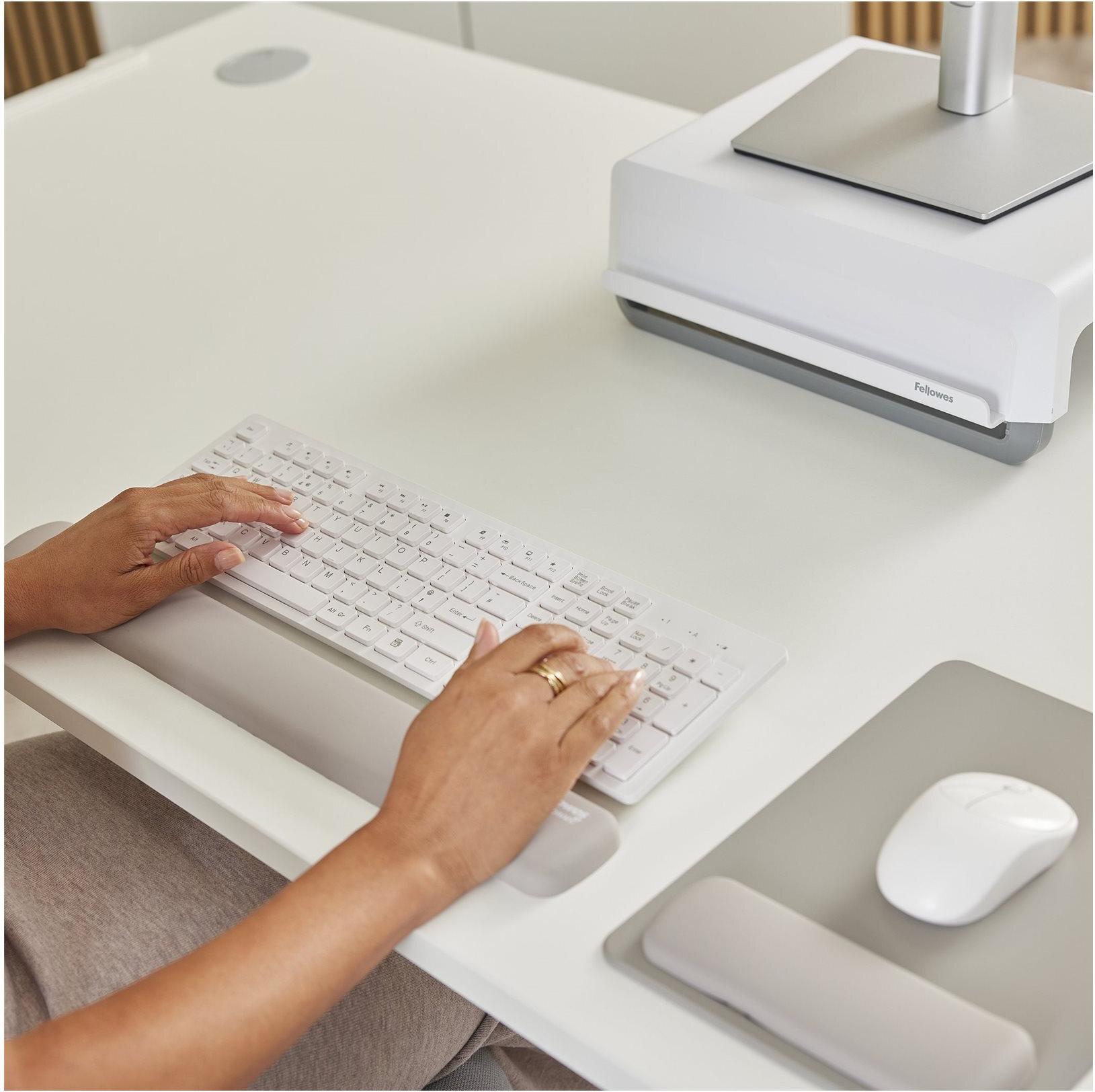 Die Fellowes Breyta Tastatur-Handballenauflage wurde entwickelt, um den Komfort und die Produktivität beim Tippen zu verbessern. Sie besteht aus Silikon und verfügt über eine weiche Oberfläche, die ein luxuriöses Gefühl vermittelt und gleichzeitig eine optimale Unterstützung für die Handgelenke bei längerem Gebrauch gewährleistet. Die HEX Cushion Technology passt sich der individuellen Form der Handgelenke an, fördert eine korrekte Körperhaltung und reduziert Belastungen. Die Handballenauflage ist staubabweisend und verfügt über einen antimikrobiellen Microban-Schutz, der dazu beiträgt, einen sauberen und hygienischen Arbeitsplatz zu gewährleisten. Darüber hinaus ist sie vollständig recycelbar und somit eine umweltfreundliche Wahl für Nutzer, die Wert auf Nachhaltigkeit legen.