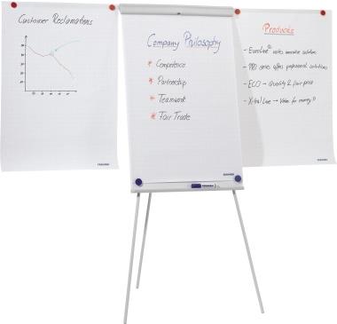 Flipchart-Tafel X-tra!Line Standard Plus. Tafel magnethaftend. Tafel beschreibbar. Typbezeichnung der Stativform: Dreibeinstativ. Abmessung der Standfläche: 95 x 110 cm. Gesamthöhe: 188 mm. Ausführung der Höhenverstellung: stufenlos bis 188cm. Werkstoff: Kunststoff. Ablageschale vorhanden. Anzahl der Arme: 2 Stück. Masse (Gewicht): 11 kg. Größe (B x H): 68 x 105 cm. Farbe des Gestells: Grau. Verpackung: Karton.