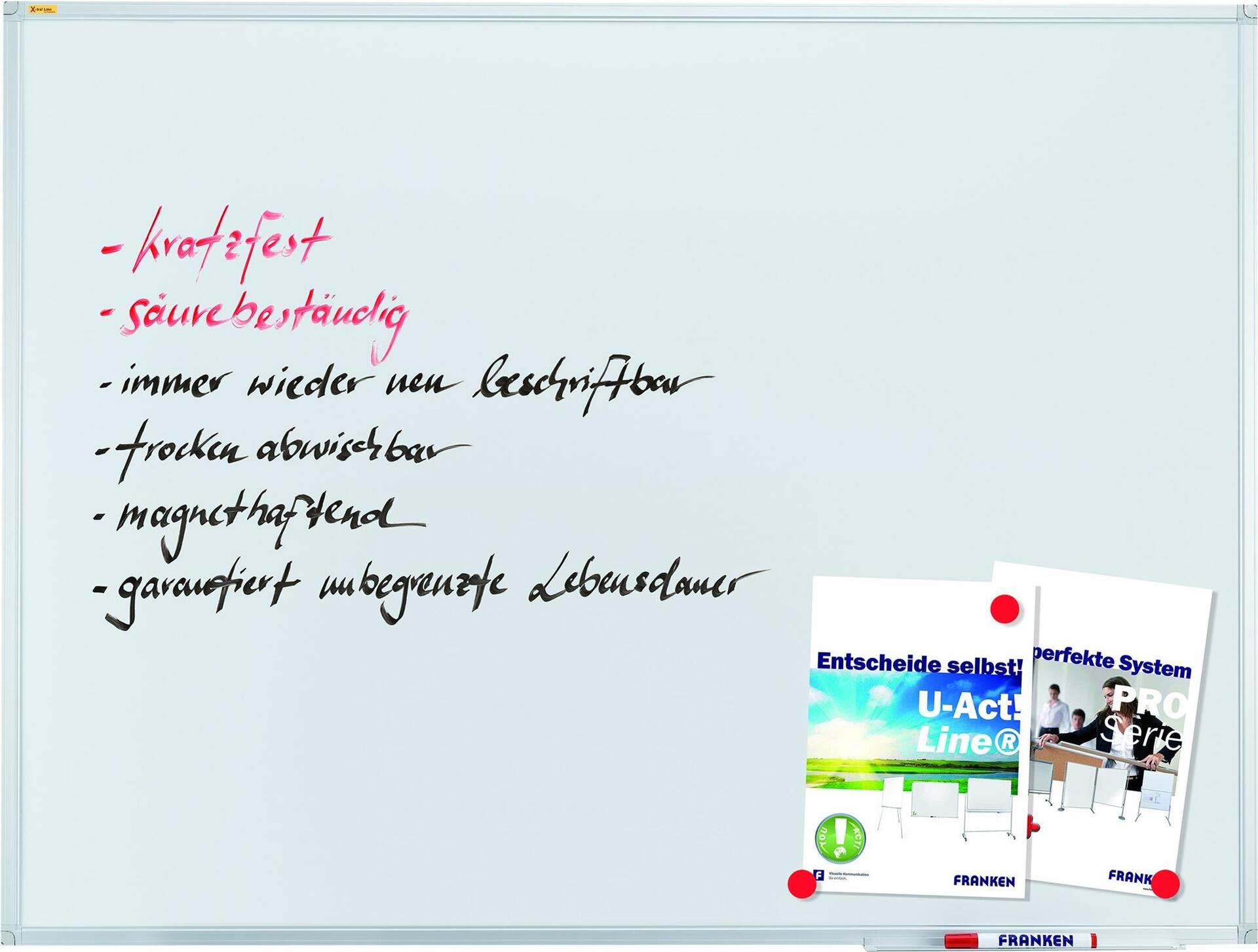 Die emaillierte Stahl-Oberfläche ist magnethaftend, beschriftbar und trocken abwischbar, zudem kratzfest, lösungsmittel- und säurebeständig. Sie ist ideal für den Dauergebrauch mit FRANKEN Tafelschreibern.