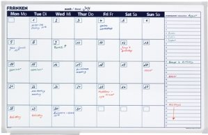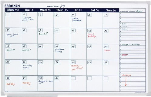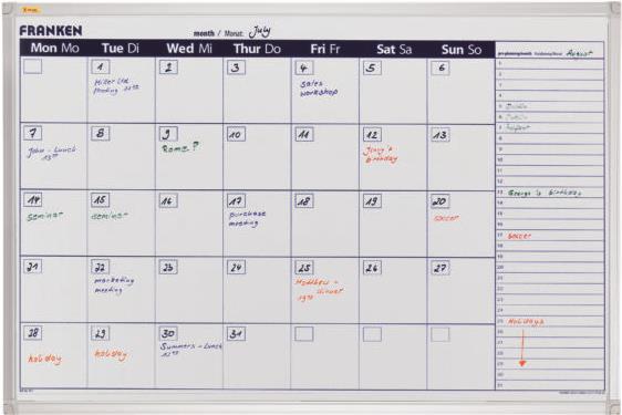 Dieser Planer lässt sich zum einen als Monatsübersicht und zum anderen als 7-Tage-Woche verwenden. Der Rahmen ist aus silbereloxiertem Aluminium. Eine Extraspalte auf der rechten Seite dient für die Vorplanung des Folgemonats oder weitere wichtige Informationen.