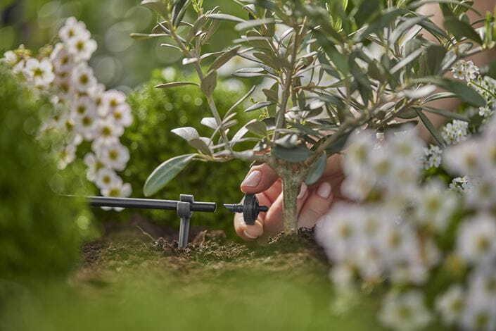 Nutze den druckregulierenden Endtropfer 2 l/h von GARDENA, um einzelne Topfpflanzen am Ende des 4,6-mm-Verteilerrohres zu bewässern. In ...